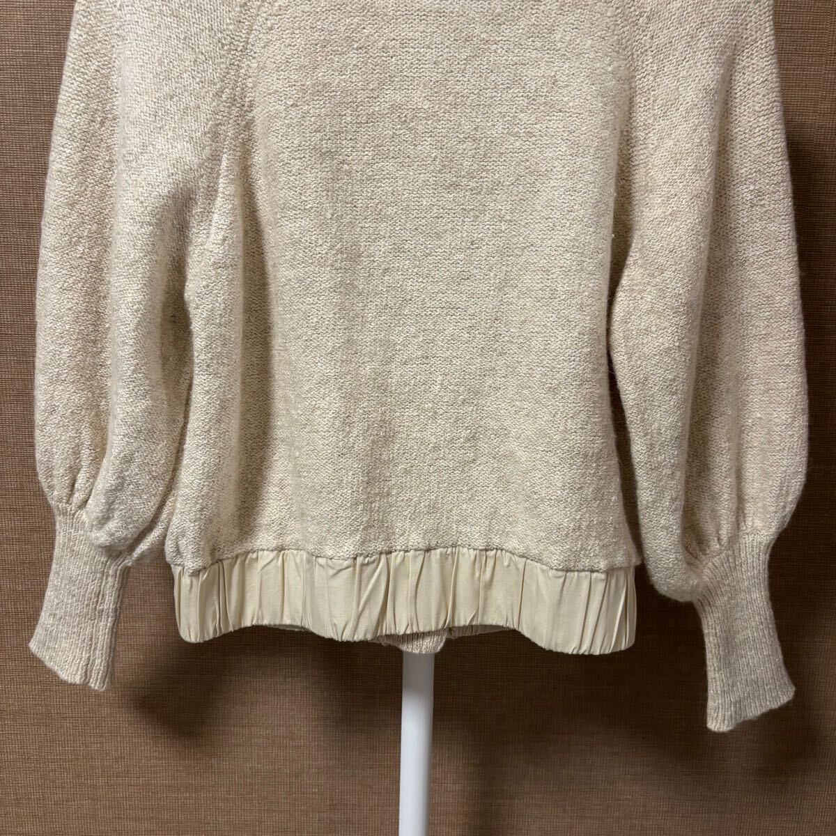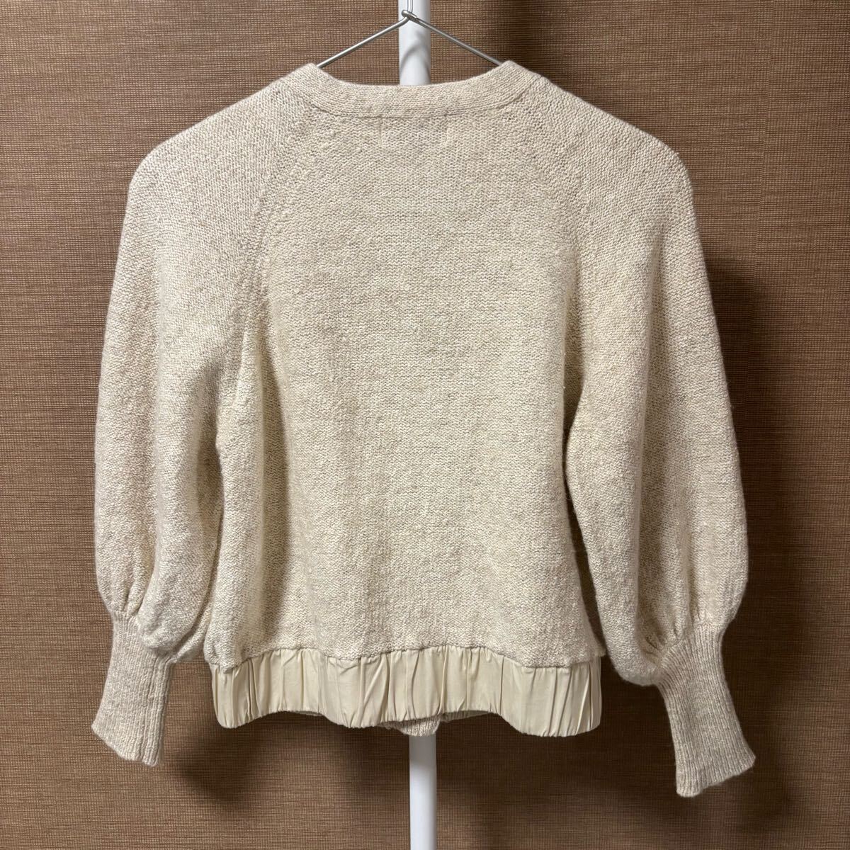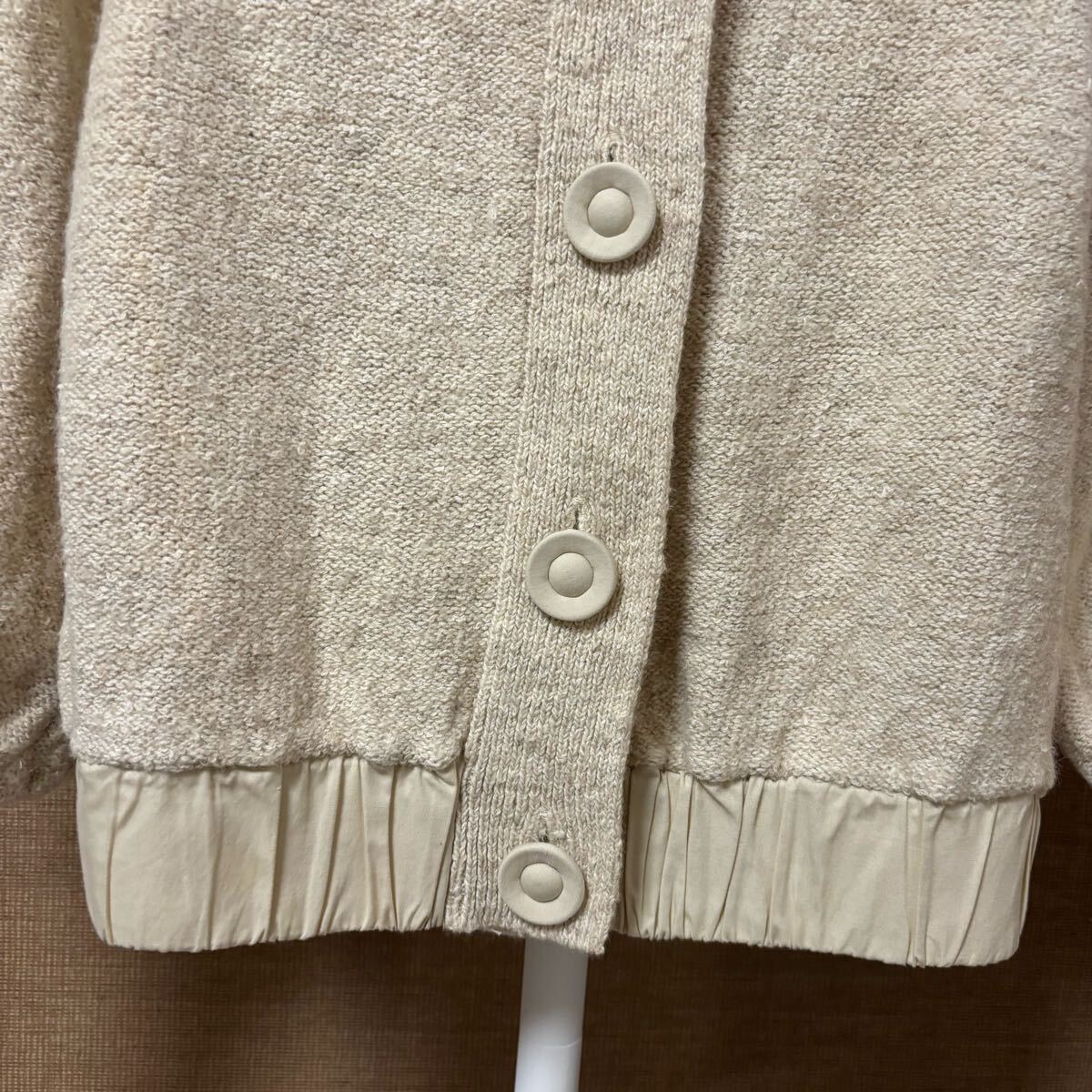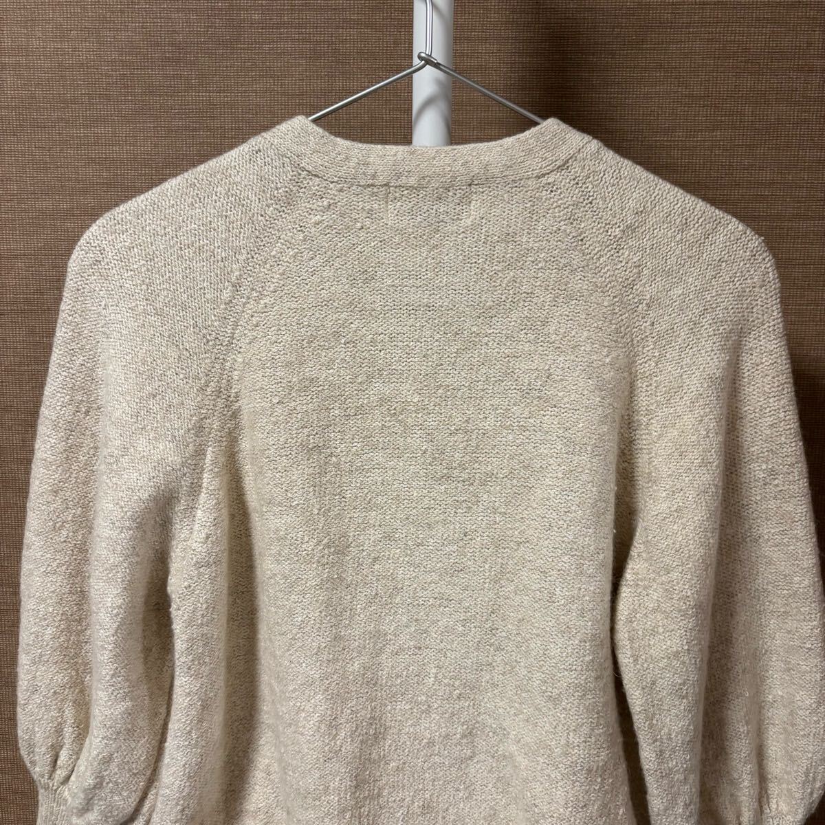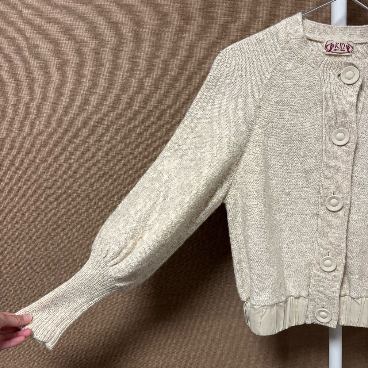 アイボリーのニットカーディガン、大きなボタン付き、パフスリーブデザイン。