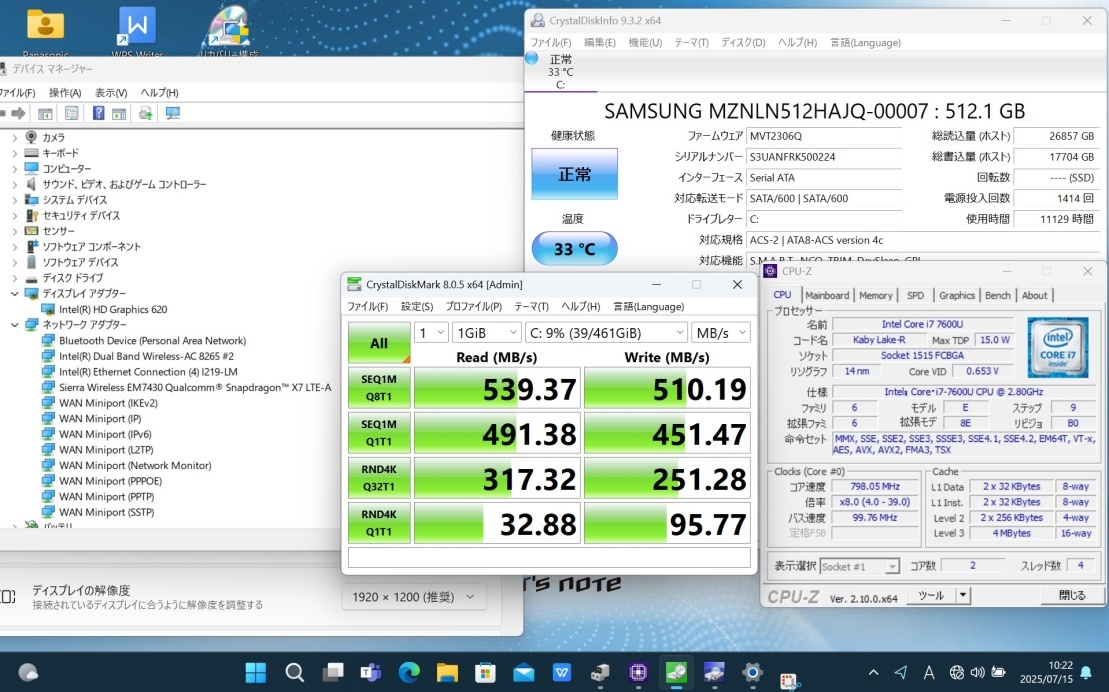 CPU: 超高速 Intel 七世代Core i7-7600u 2.8Ghz、 (ターボ・ブースト利用時の最大周波数 3.9GHz) |