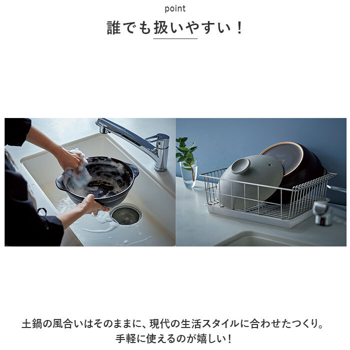 商品説明 | ・・驚きの軽さで使い勝手抜群!「Karl IH軽量土鍋 6.5号」が新登場。 ・【軽いのに丈夫!】 ・素地は薄づくりで、一般的な土鍋製品の約1/2の重さ!プロが認める超軽量のIH土鍋。 ・【吸水率ほぼ0%!THERMATEC製】 ・水張り吸水0.5%以下!カビの心配が少なく、お料理のにおいが染み付きにくいのがポイント。(※吸水率とは、鍋に水分が染み込む割合を示したものです。) ・【面倒な手間なし♪】 ・使い始めの”目止め”の作業が不要。 ・【吹きこぼれにくい!】 ・深めのフチ&独自のカーブで、ふきこぼれにくい形状を実現。 ・【あらゆる熱源に】 ・本体は耐熱温度差500度クリアの高耐熱素材!IH(200V/100V)・ガス火・電子レンジ・オーブンレンジ・ハロゲンヒーター対応。 ・【多層構造で安心・安全】 ・ガラス質で守られている銀膜(発熱体)が加熱ムラを減らし、異常加熱を防止。 ・【食材本来の美味しさを引き出す♪】 ・遠赤外線効果により、食材を芯からじっくり加熱。 ・【誰でも扱いやすい!】 ・土鍋の風合いはそのままに、現代の生活スタイルに合わせたつくり。手軽に使えるのが嬉しい! ・【おしゃれなデザイン】 ・ムダのないシンプルさ!キッチンや食卓に馴染みやすいカラー使いも魅力。 ・【1人用~2人用に】 ・・1人暮らしの方やご夫婦2人暮らしの方にぴったりな6.5号サイズ。容量は0.8L。 |