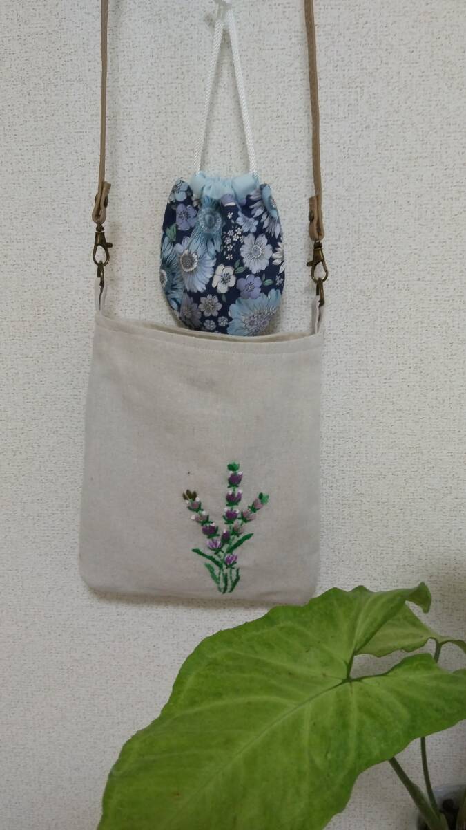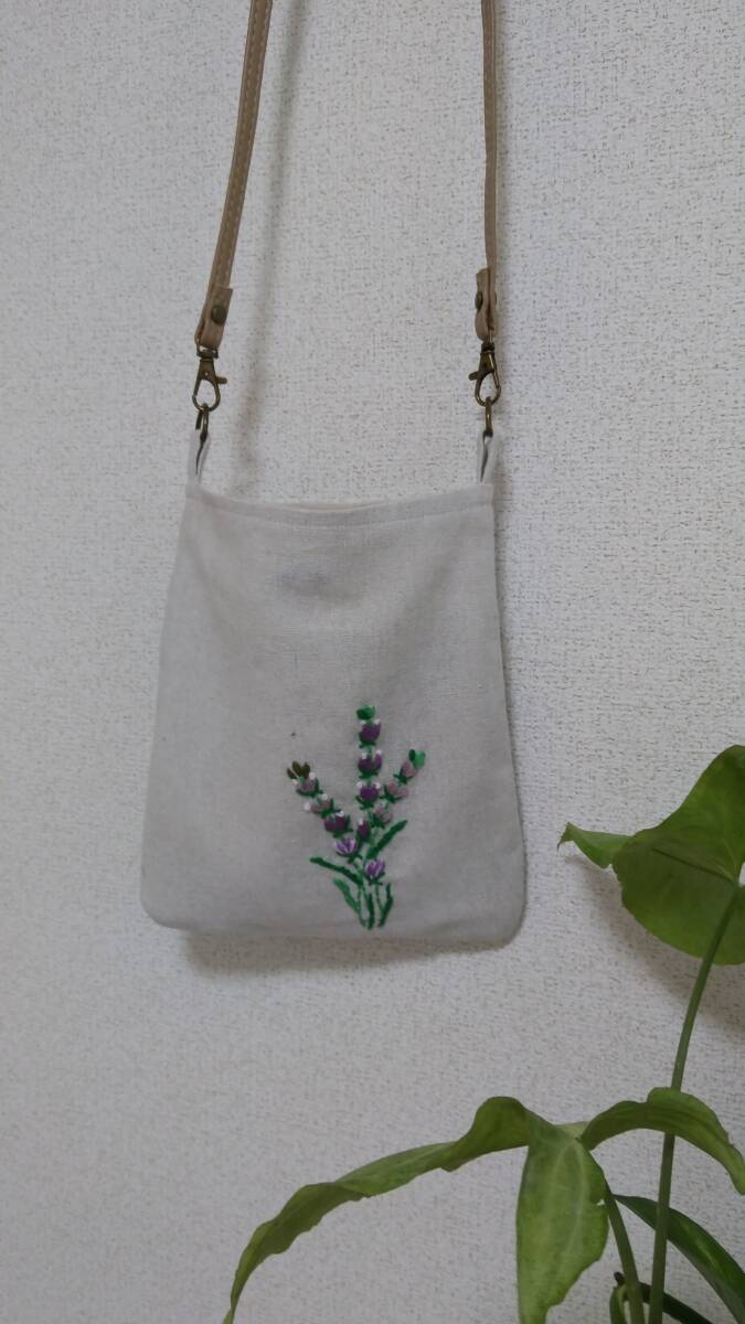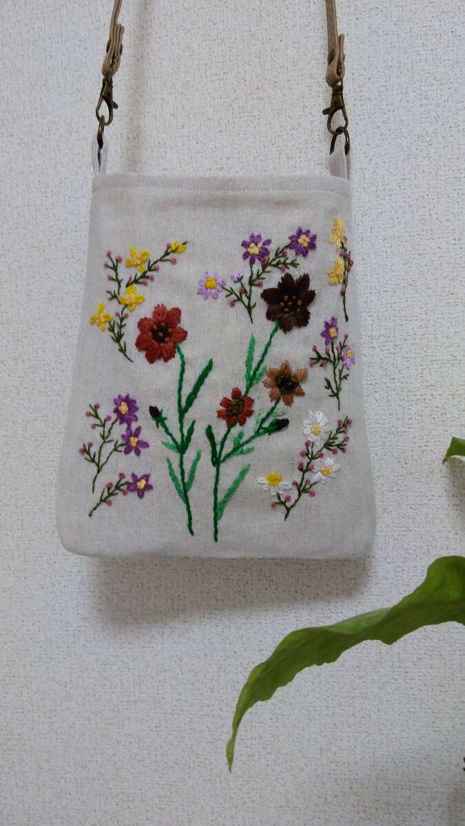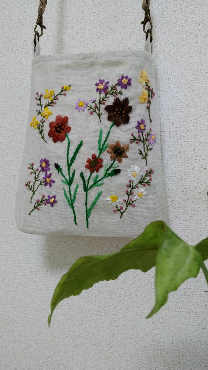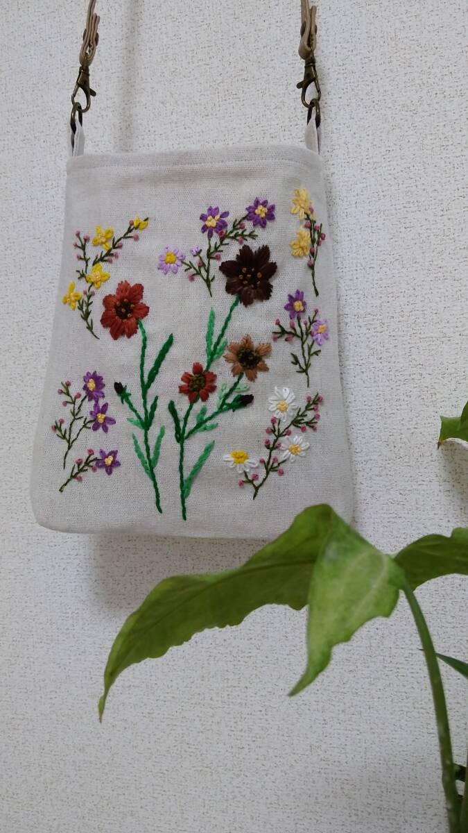 ハンドメイド・オンリーワンのバック・手刺繍・リネン・チョコレートコスモス・ヒソップ・ハーブ・手刺繍ショルダー/斜め掛けバック
