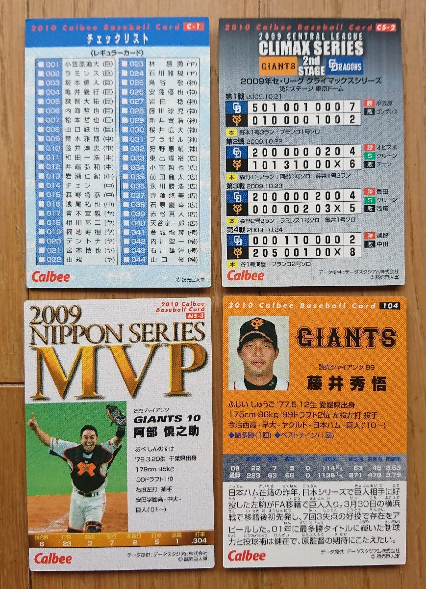 【カード・カルビー2010年】C-1 チェックリスト/CS-2 クライマックスS/NS-3 日本シリーズ/藤井秀悟 104 計4枚セット 読売ジャイアンツ