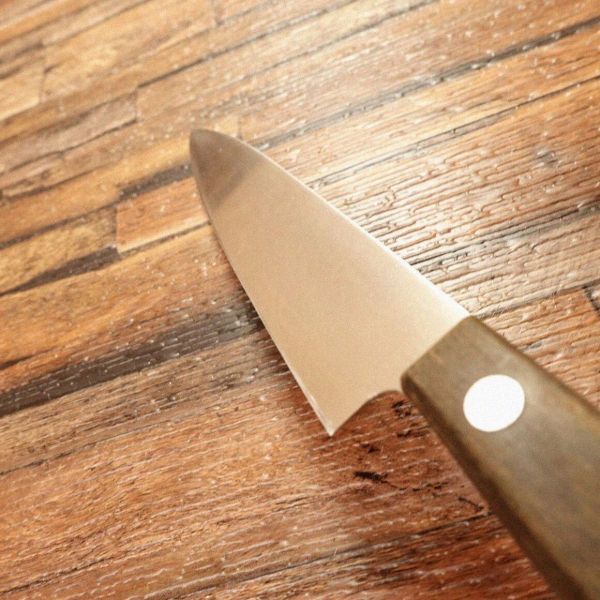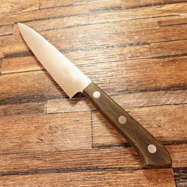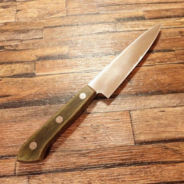 ペティナイフは、果物の皮むきや飾り切り、細工などに便利な小型の包丁です。少し深緑がかった柄が特徴的なヘンケルス・アムウェイのシンプルなお品です。