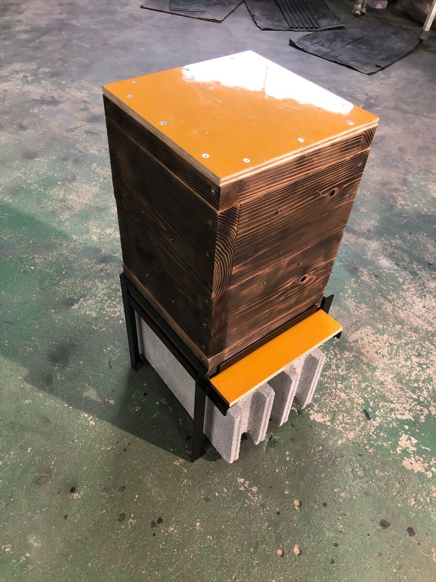 日本蜜蜂養蜂巣箱用のハンドメイド鉄製台です。外形28㎝~29㎝角の巣箱をのせることができます。巣門は約6mmでスズメバチの侵入を防ぎます。底板の下に適当な物を挟むことで巣門を更に狭める事も可能です。
