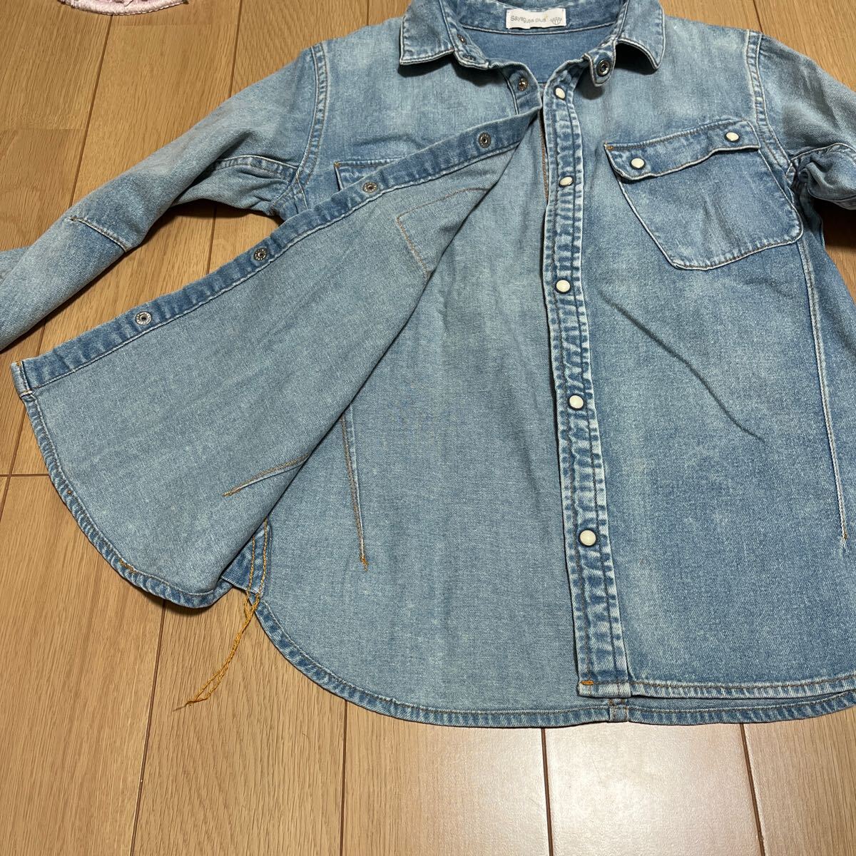 デニムシャツ 左右の見頃の裾の部分に糸が出ていますが、もとからのデザインです。