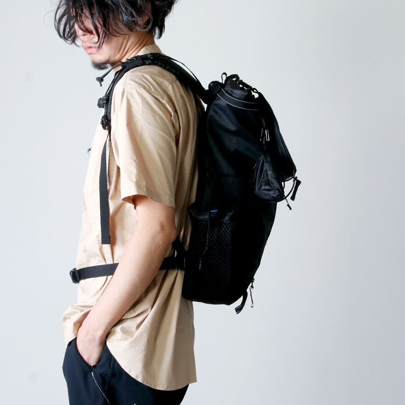 素材にはDIMENSION POLYANT社のX-Pac生地を使用(現行モデルはリサイクル素材ECOPAC生地です。品質はほぼ変わりません)。 そのX-Pacとインビスタ社のシリコンコーティングされたコーデュラナイロン素材を組み合わせた、どんな場所や天候でも快適に使用できる、軽量バックパックです。 メインコンパートメントには、バッグ上部の巾着か、バッグ前面に斜めに走る止水ジップからアクセス可能。 フロントの斜めのジップは、上下どちらからも開閉できるダブルジップを採用しているので、荷物の出し入れが非常に簡単。 バッグ上部は巾着式になっていて、開口部を隠したり、雨からの保護のために、デタッチャブルタイプの雨蓋が付属。 雨蓋はジップ付きで、フロントバッグにしてマップポケットとしても使用可能。 両サイドにはメッシュポケット、カラビナ付きの小型ポーチも付いていて、小銭や鍵などを好きなところにぶら下げることもできます。 今までのバックパックよりも素材やディティールにさらに拘り、スタイリッシュに進化したバックパックです。