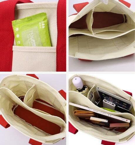 複数の仕切りが付いており、スマホや財布、タオル、たばこ、ペットボトル、傘などをポケットに入れたり、iPadやA4書類、本も収納できます。