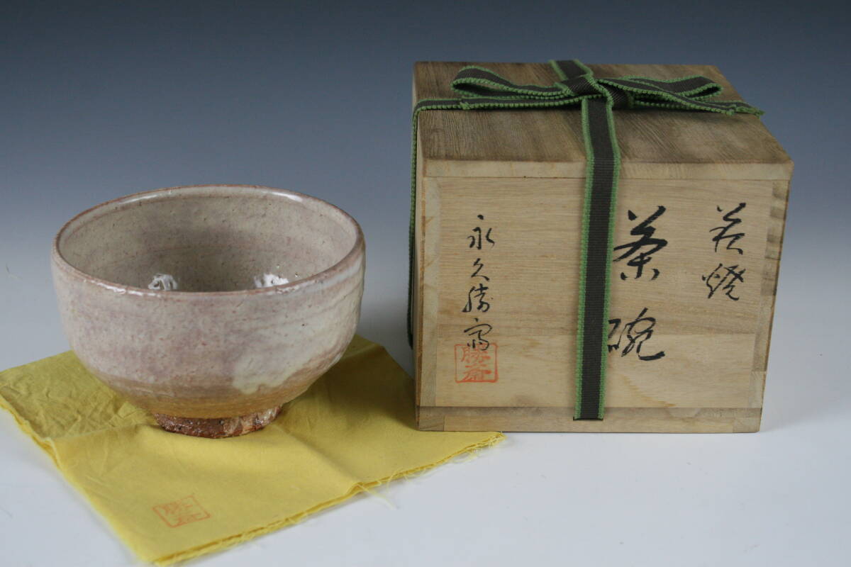 出品の作品は、伝統的な技法に現代的な感性を融合させた作風で名高い萩の人気作家、永久勝斎 作 琵琶色萩茶碗です。大道土を轆轤で楽形に成形後、長石釉を掛け登り窯により焼成、砂目の多い土味、窯変が見事です。呉器形の手に馴染む手取り、見事な焼成、土味、窯変どれをとってもすばらしい出来栄えの「永久勝斎 作 萩茶碗」を是非この機会にお求め下さい。