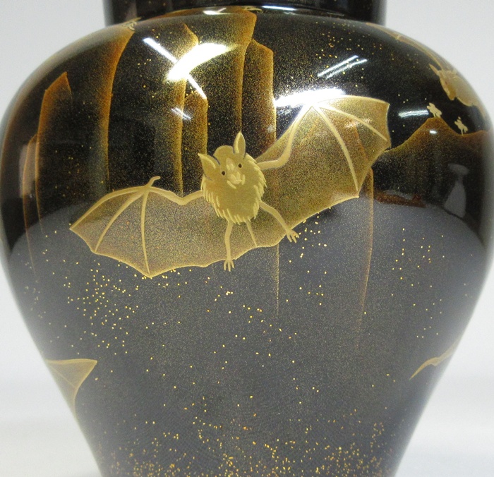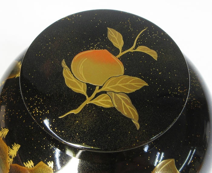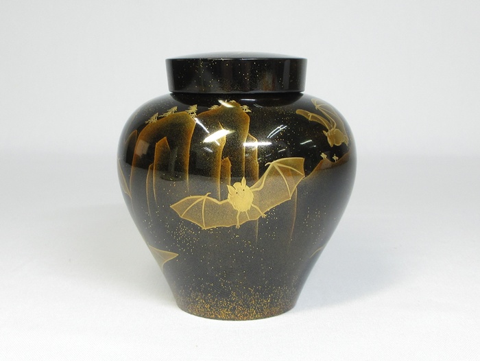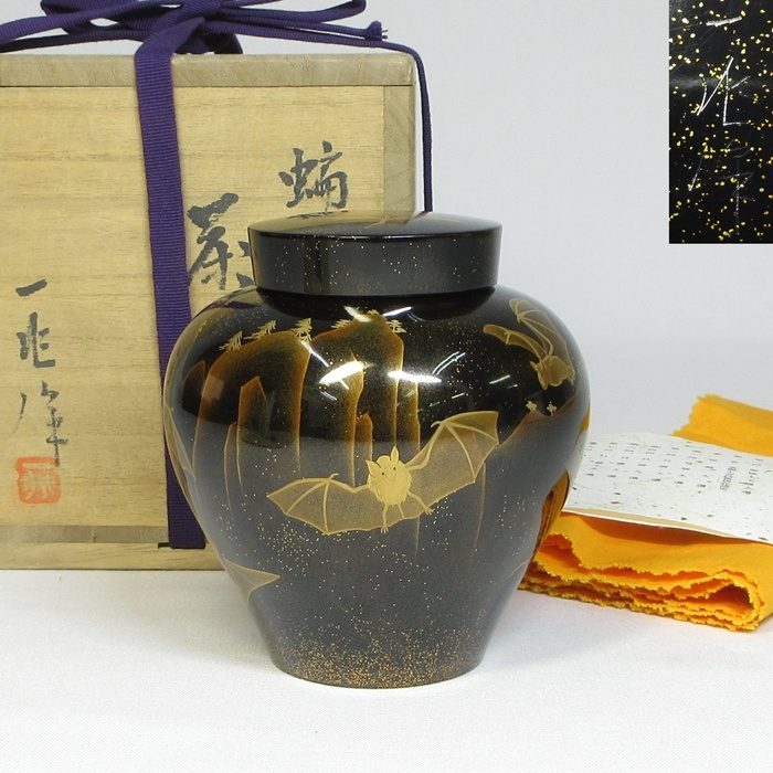 【B0136】茶器 漆芸 輪島塗 一后一兆 蝙蝠に桃図 吉祥文 茶壺 茶壷 茶入 共箱 栞付き