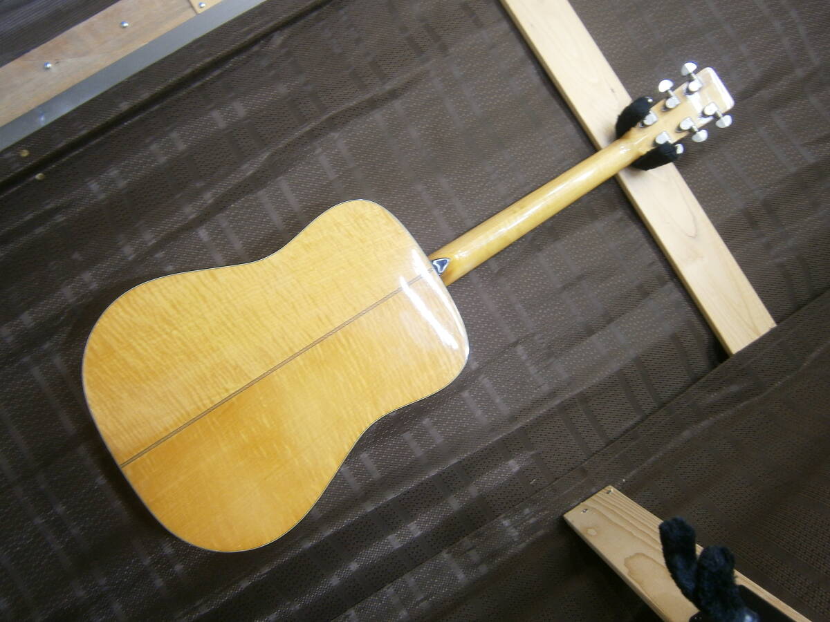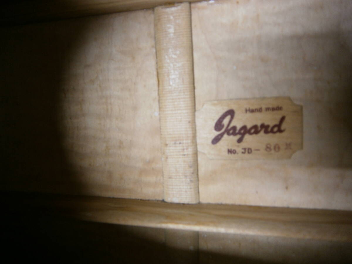 ◎ジャガードの、JD-80Mです。寺田楽器製作の70年代、日本製です。トップ:スプルース単板、サイド・バック・ネックはメイプル仕様です。ペグは、オールドグローバー製です(画像あり)。ネックはダイヤモンドボリュウトがある丁寧な良い作りです(画像あり)。ボディトップとバック周り・指板サイド・ヘッド周りは鼈甲柄の仕上げでの高級感があります(画像あり)。ヘッドロゴも綺麗な仕上げです(画像あり)。ネック・ボディともに、とても丁寧な良い作りです。音ですが主観になりますが、倍音も豊富で音量もあり、カラッとした感じの音質で、とても鳴りの良いギターです。