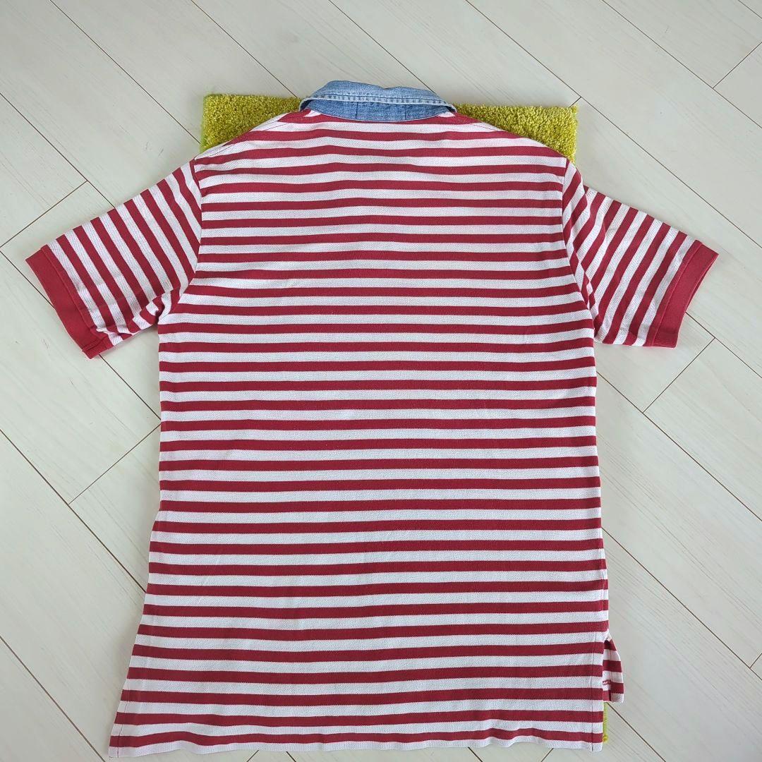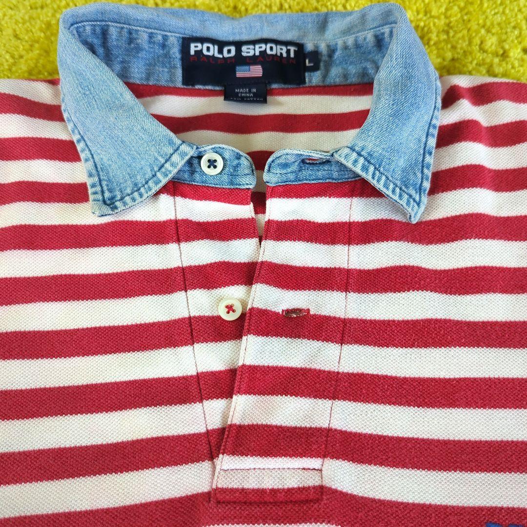 赤と白のストライプデザインにデニムカラーの襟が特徴的なPOLO SPORTのポロシャツ。