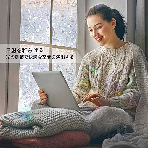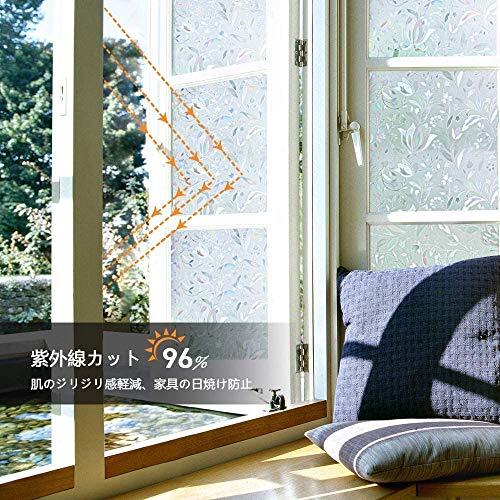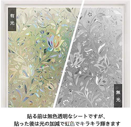 ・花信風 44.5x200cm ・・Size:44.5x200cm・【明るい目隠し対策・室内暗くない】窓ガラス目隠フィルムの可視光通過率は85%、20cmほど離れれば、外から室内が見えづらくなります。カーテンを開けたり閉めたりする面倒がなくなります。光を適度に取り入れて、明るさを保ちながらお手軽にプライバシーを保護できます。・【美しい虹色の輝き・おしゃれな花柄】窓フィルム本体は無色ですが、光に当たると、虹色の輝きを放して、部屋に映ってとても綺麗です。光の加減で色の強弱が違います。光の強い所で使うのをおすすめします。立体感あふれ、低コストで地味なガラスをステンドグラス風ガラスに瞬間変身!お店、展示棚など魅力が必要な場所にもおすすめです。・【uvカット・日焼け防止】窓フィルムは太陽光の波長の差を利用して、紫外線を遮断し、眩しさを和らげ、快適な室内空間を作り出します。紫外線(uv)を96%カットすることにより、床材や家具の老化を抑えます。・【簡単貼り付ける窓用フィルム】ツルツルのガラス面に適用。水だけで貼り付け、何度でも貼り直しok!接着剤使わず、賃貸ok!静電気で吸着さおしゃれな花柄のガラスフィルム 窓ガラス目隠しシート