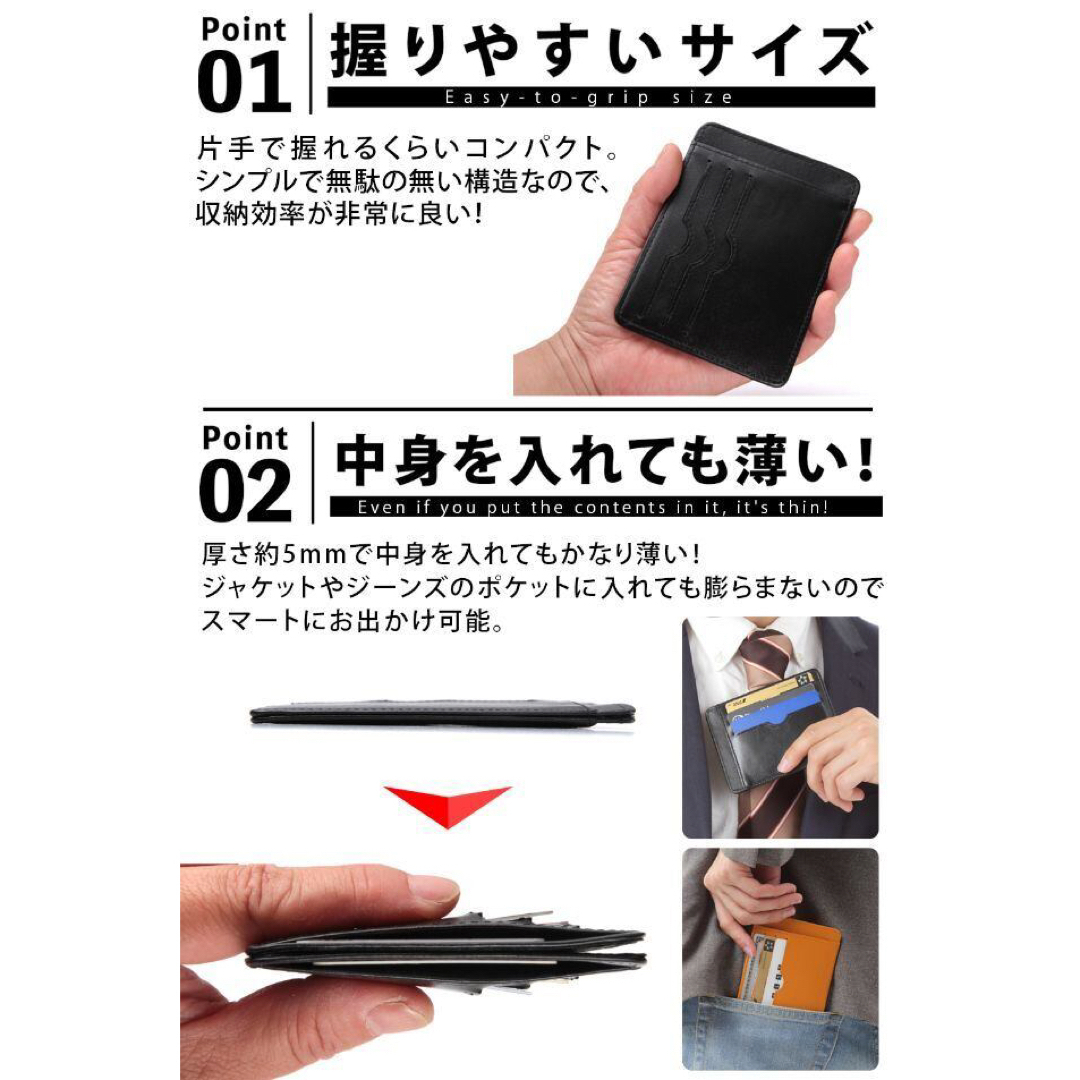 厚さ約5mmで中身を入れてもかなり薄いです!ジャケットやジーンズのポケットに入れても膨らまないのでスマートにお出かけが可能です。