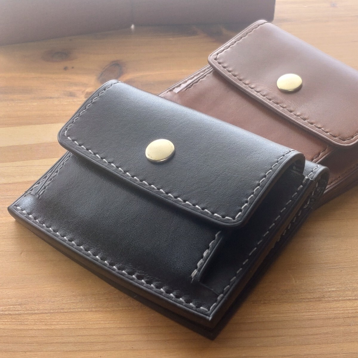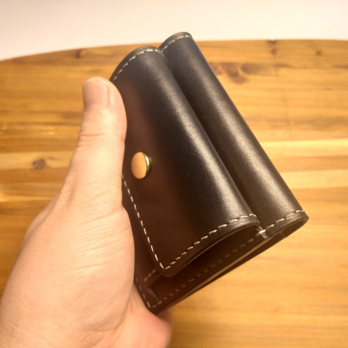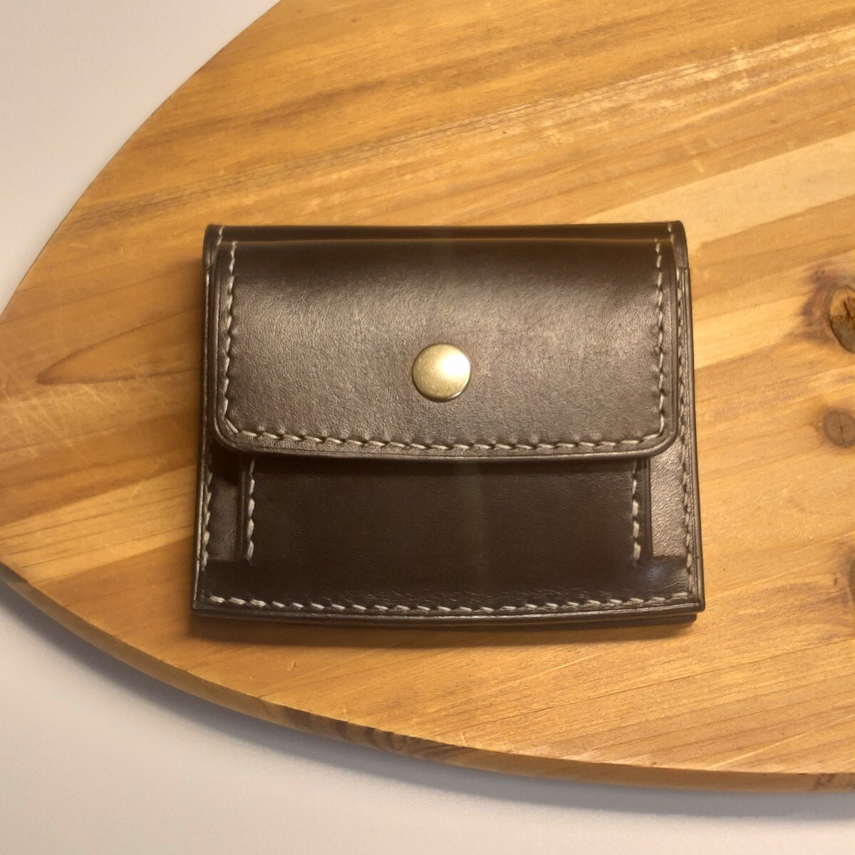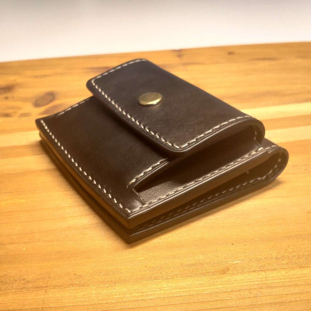 ■2種類の牛革を使用したコインケースが外側に付いた二つ折りコンパクトウォレットです。手のひらサイズでコイン、カード、お札を十分に収納できます。カードは内装カードポケット、本体とコインケースの間に複数枚重ねて収納可能です。お札は折らずに収納可能なです。製作時にオイルアップ済みですのでそのままお使い頂けます。使用した牛革は使い込む程に光沢が増し、柔らかくなるタンニン鞣し牛革を使用しておりエイジングをお楽しみ頂けます。形状にもこだわり、下部は絶妙な曲線となっており握った時のホールド感が心地良い仕様になっています。