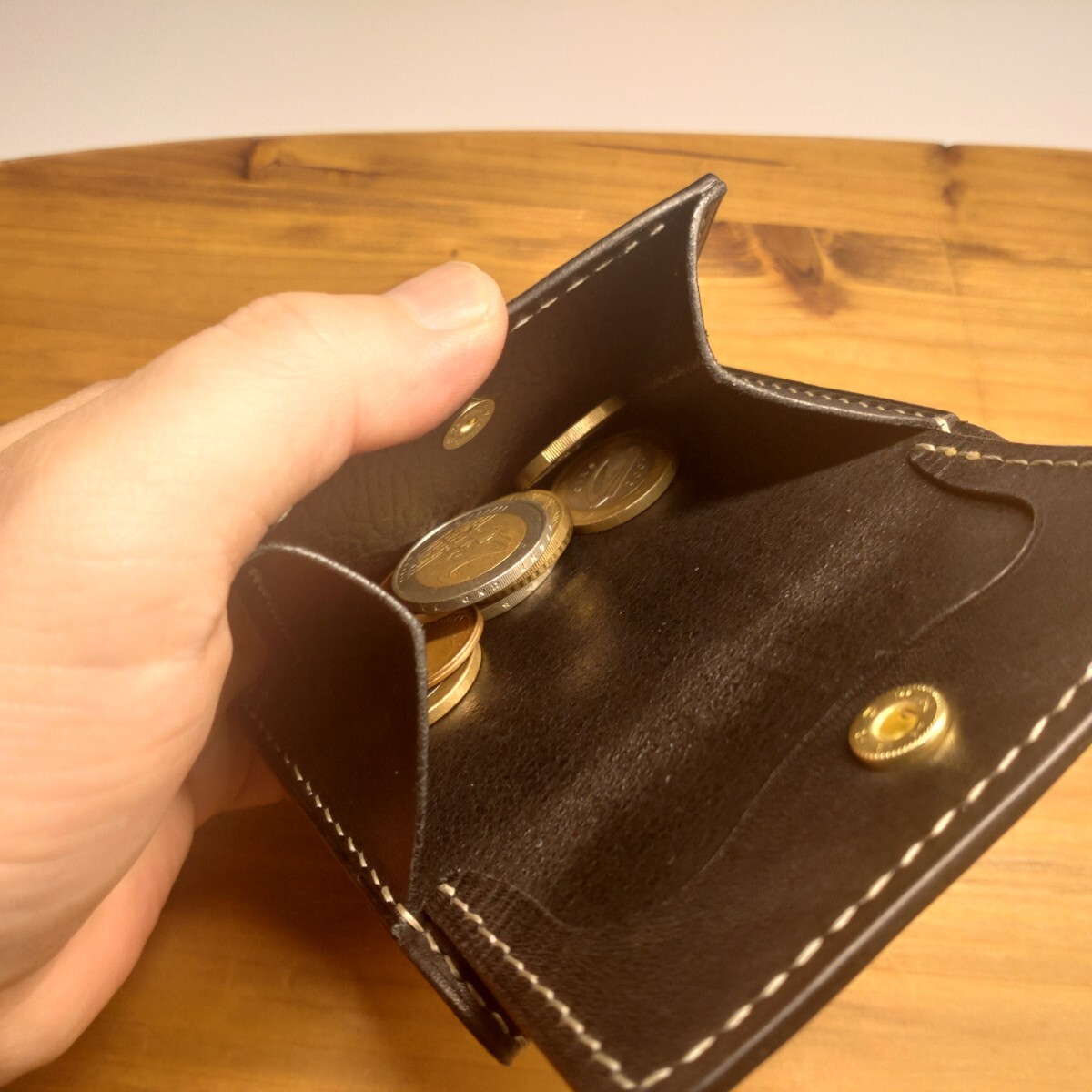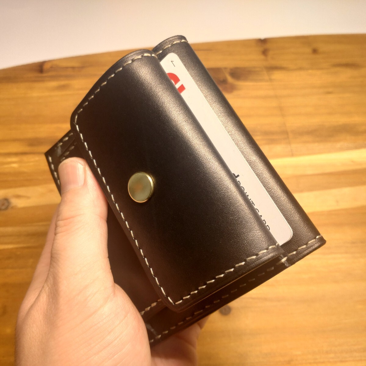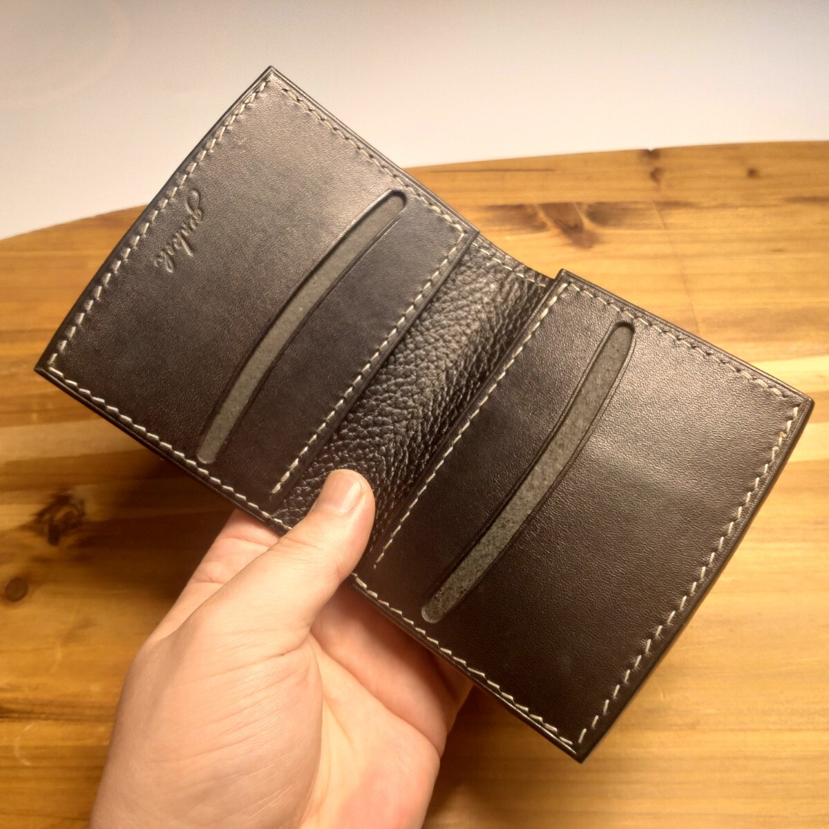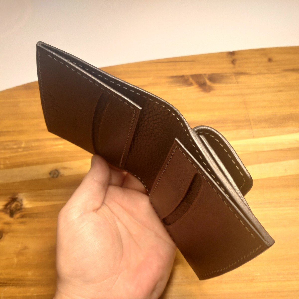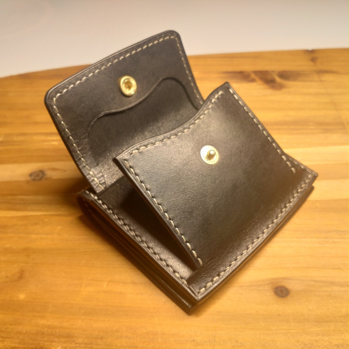 ■2種類の牛革を使用したコインケースが外側に付いた二つ折りコンパクトウォレットです。手のひらサイズでコイン、カード、お札を十分に収納できます。カードは内装カードポケット、本体とコインケースの間に複数枚重ねて収納可能です。お札は折らずに収納可能なです。製作時にオイルアップ済みですのでそのままお使い頂けます。使用した牛革は使い込む程に光沢が増し、柔らかくなるタンニン鞣し牛革を使用しておりエイジングをお楽しみ頂けます。形状にもこだわり、下部は絶妙な曲線となっており握った時のホールド感が心地良い仕様になっています。