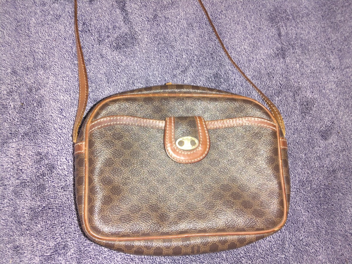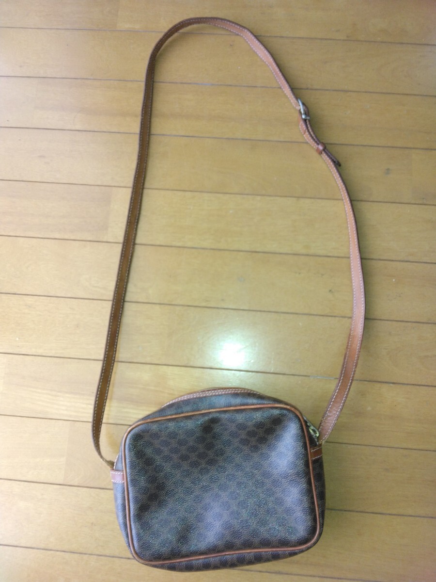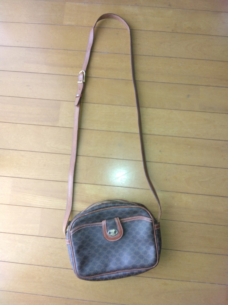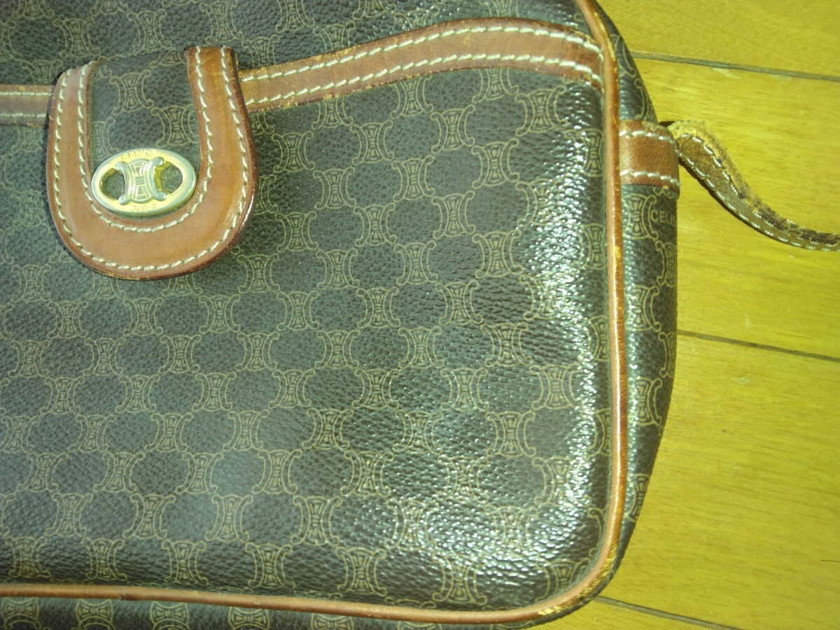 CELINE セリーヌ ヴィンテージ ショルダーバッグ トリオンフ 斜め掛けレア総柄マカダム柄レザー茶かばん鞄PVC革製ブラウン希少ゴールド金具