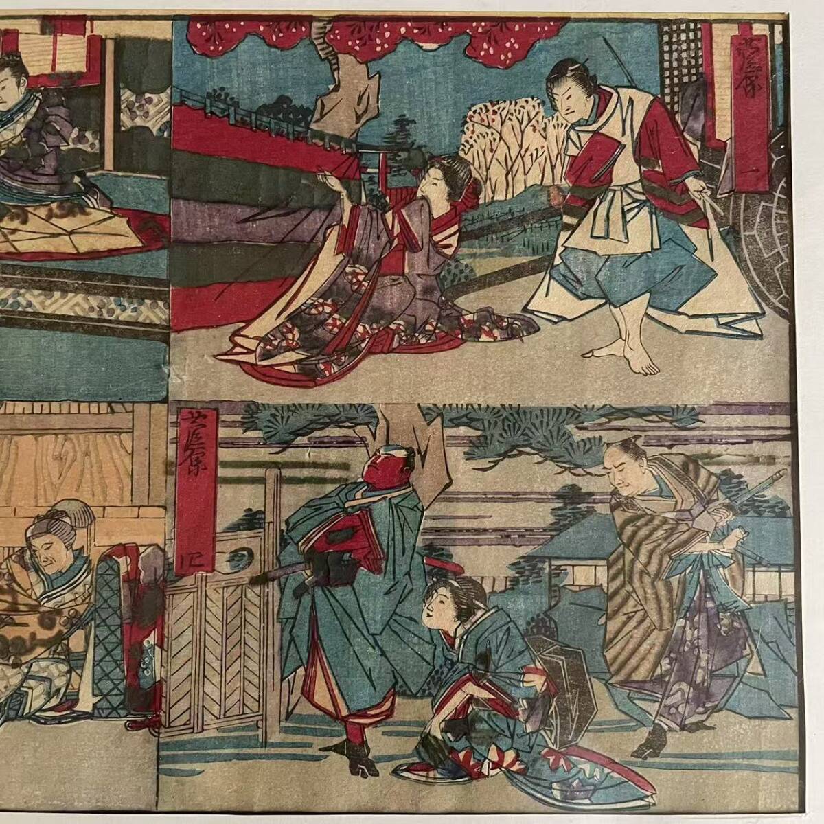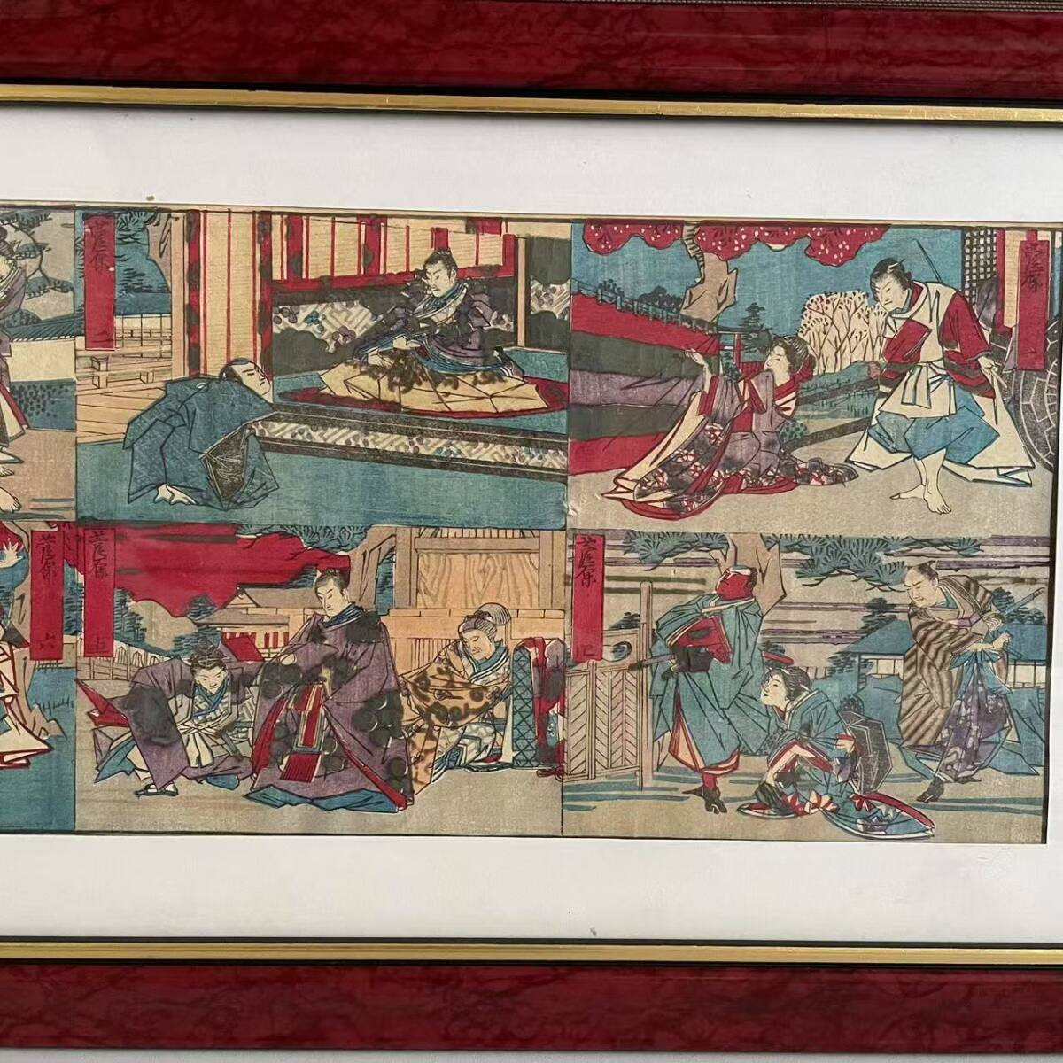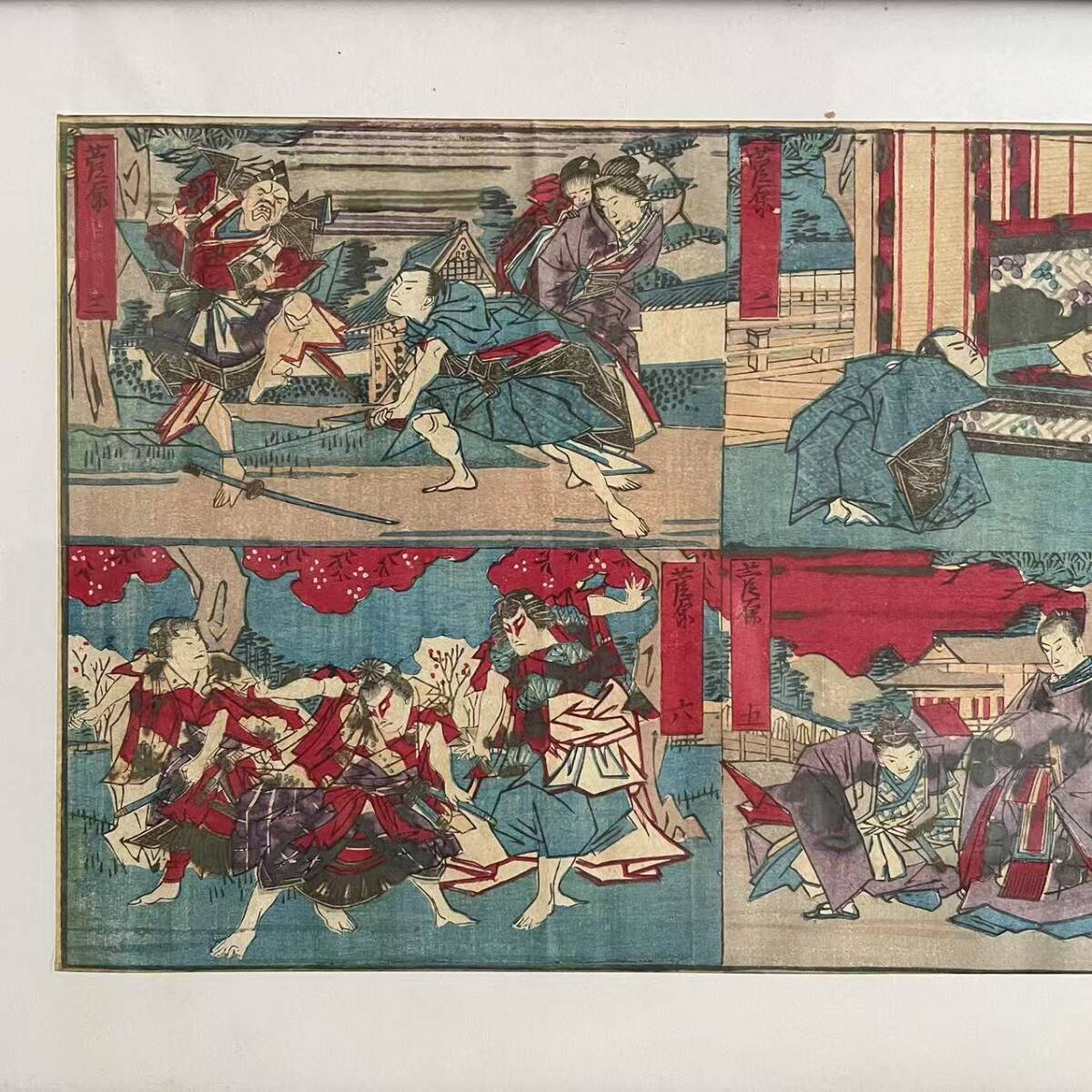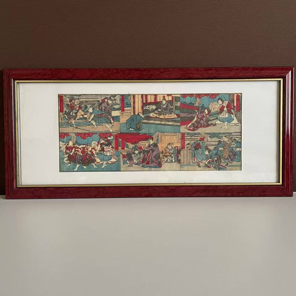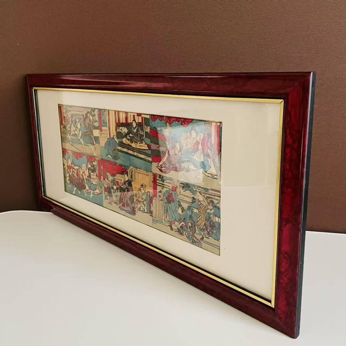 浮世絵 木版画 江戸期 三枚続 錦絵 大判 保存良い 額装 W55cmxH25cm