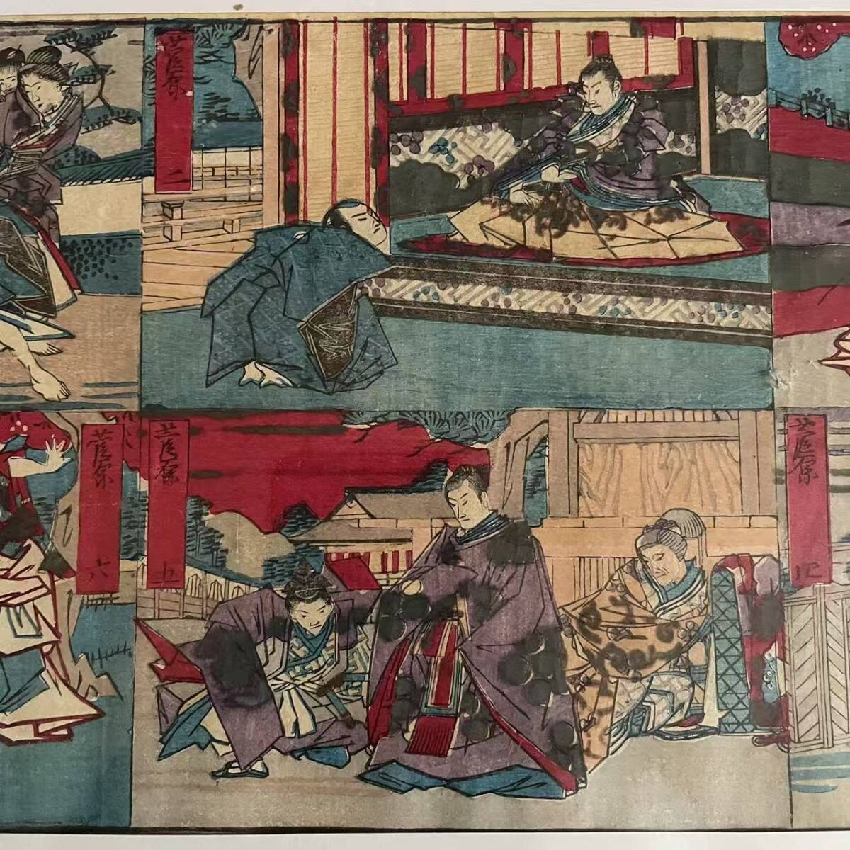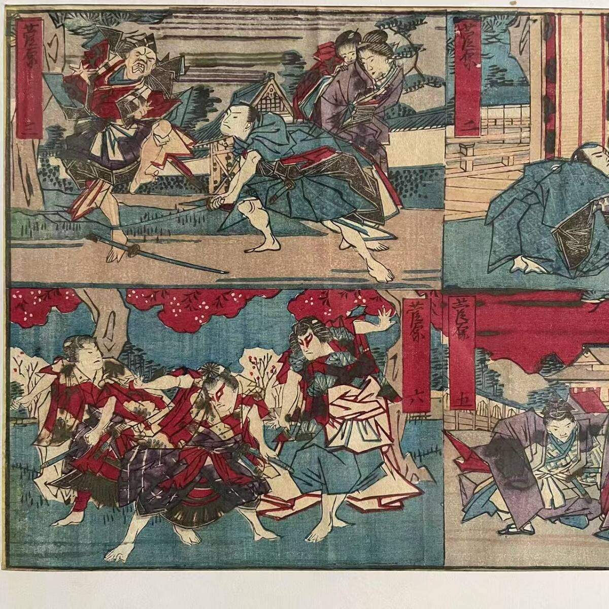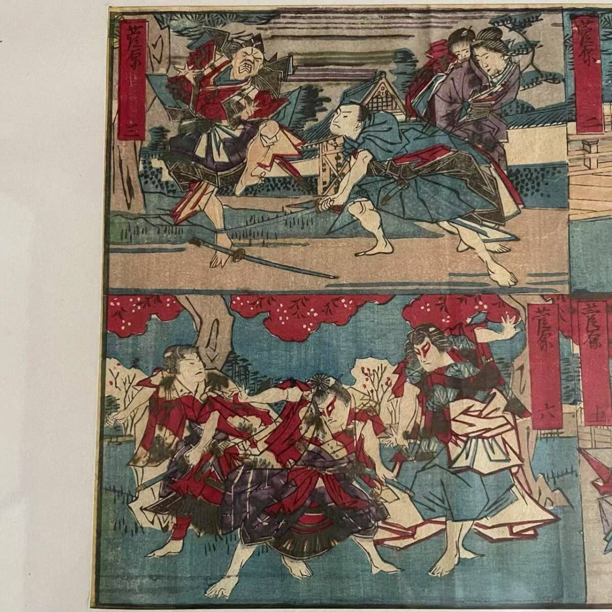浮世絵 木版画  江戸期 三枚続 錦絵 大判 保存良い W55cmxH25cm