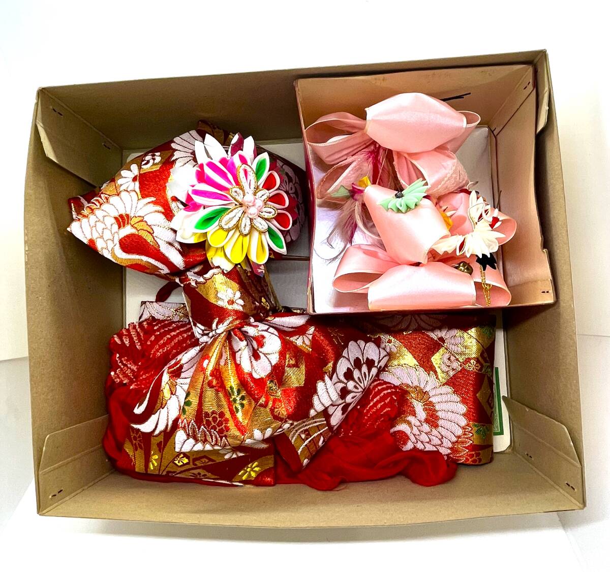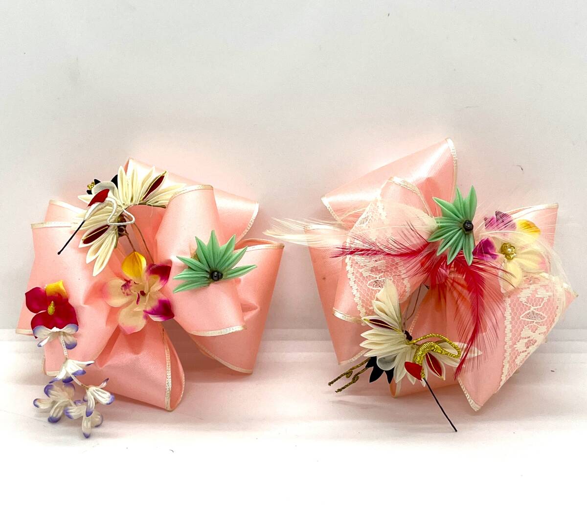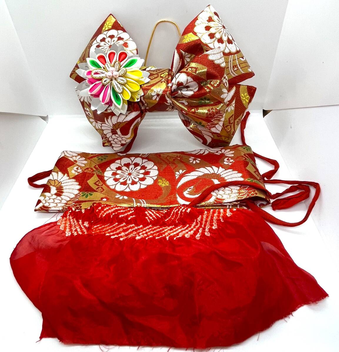 【中古】作り帯 小寸 セット 髪飾り2個付 赤/金・鶴 七五三 和装 簡単装着 浴衣 帯結び/608②1674