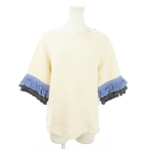 トリーバーチ TORY BURCH ニット セーター ボートネック 七分袖 フリンジ 小さいサイズ XS ライトベージュ /AO14 ■GY19 レディース