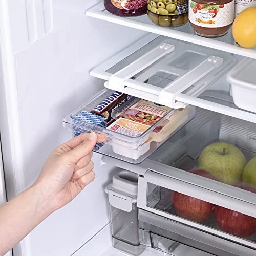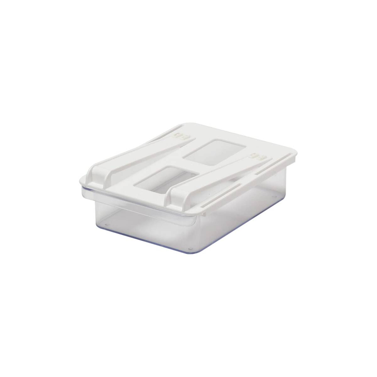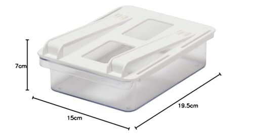 製品サイズ:(約)幅15×奥行19.5×高さ7cm 製品重量:(約)0.23kg 素材・材質:本体/AS樹脂(耐熱温度80度・耐冷温度-20度)、枠/ABS樹脂(耐熱温度70度・耐冷温度-20度)、すべり止め/熱可塑性エラストマー(耐熱温度80度・耐冷温度-20度) 生産国:日本 冷蔵庫の棚板にとりつけて引き出し収納。棚下引き出しケースです。 棚板に取り付けて、棚下スペースを有効活用できます。 バターやチーズなどがサッと取り出せる引き出し式です。 迷子になりやすい調味料もきれいに収納。冷蔵庫の中もすっきりです。 厚さ11mmまでの棚板に使用いただけます。 日本製。 ご注意:オーブン・電子レンジでは使用しないでください。 食器洗い乾燥機には使用しないでください。