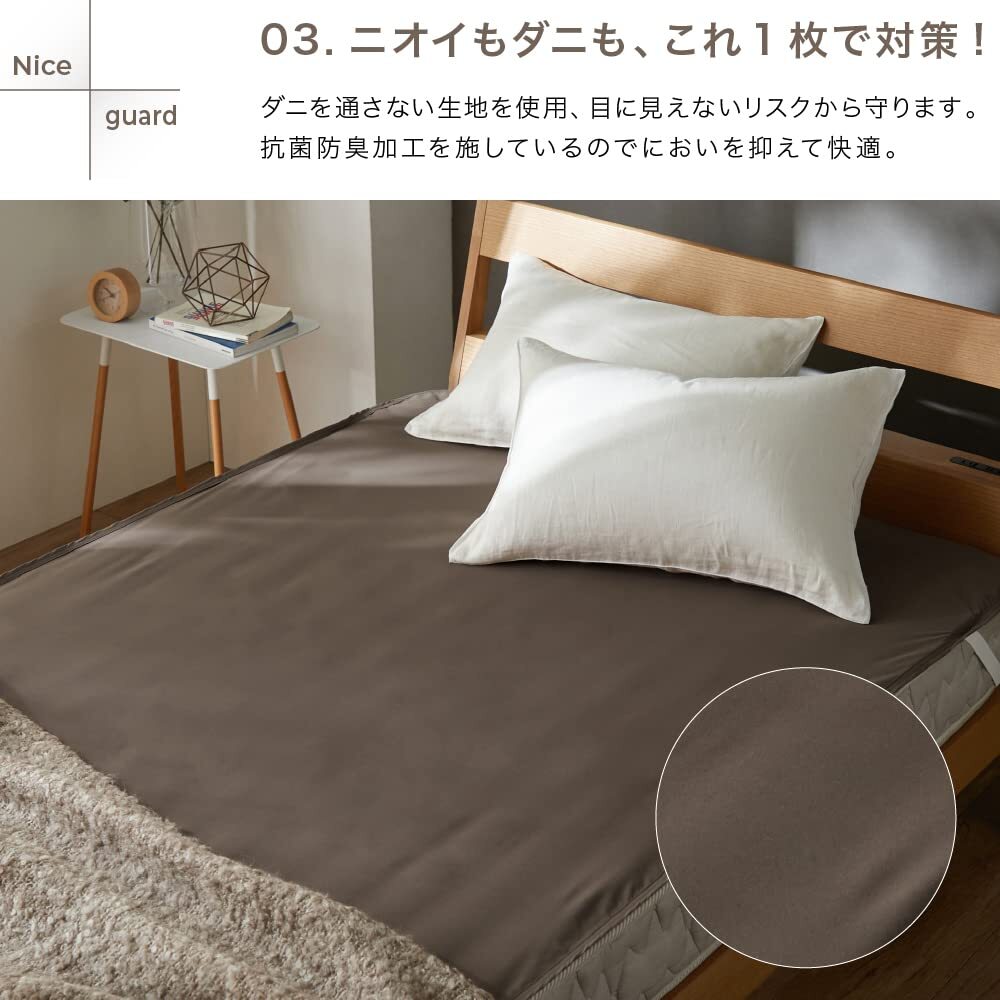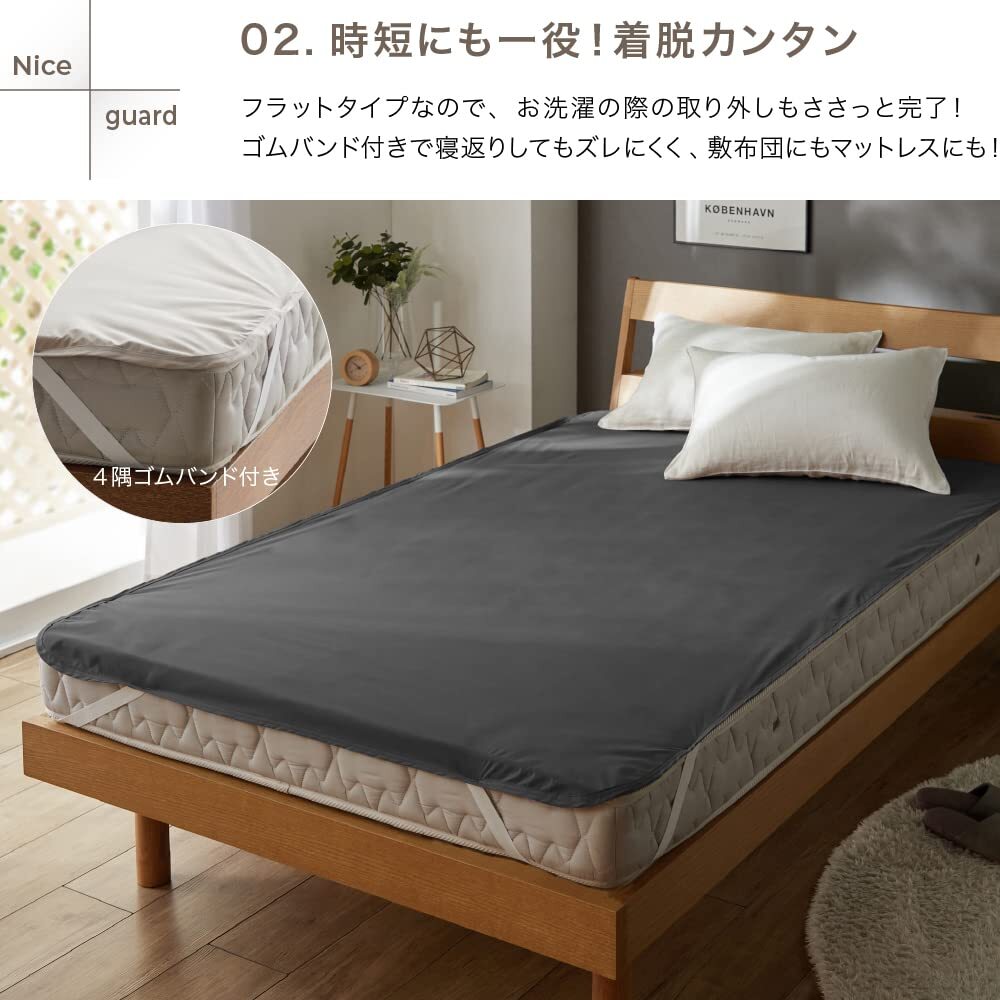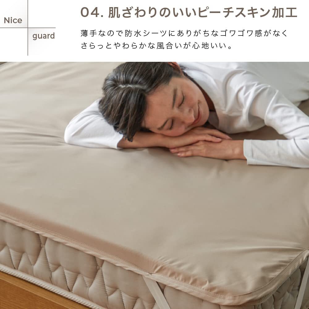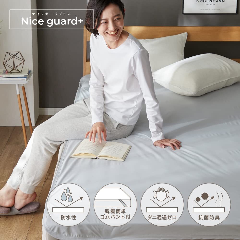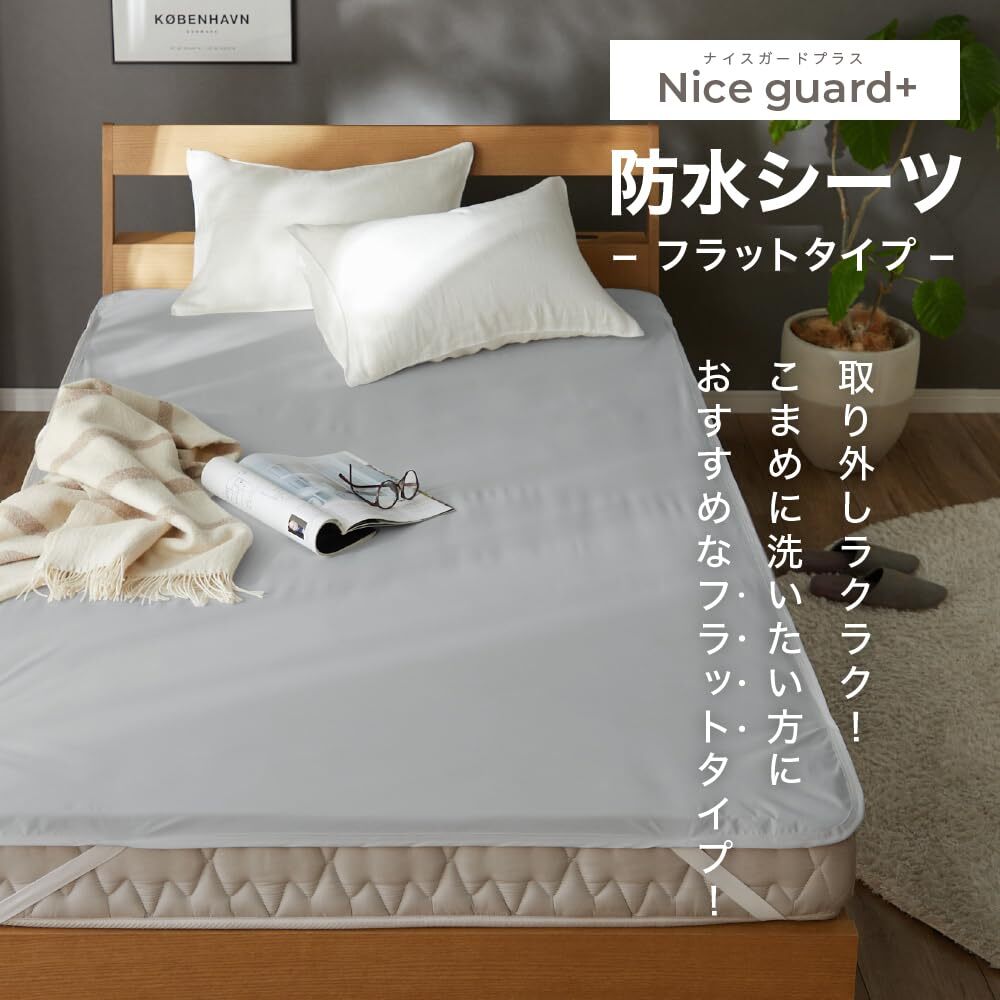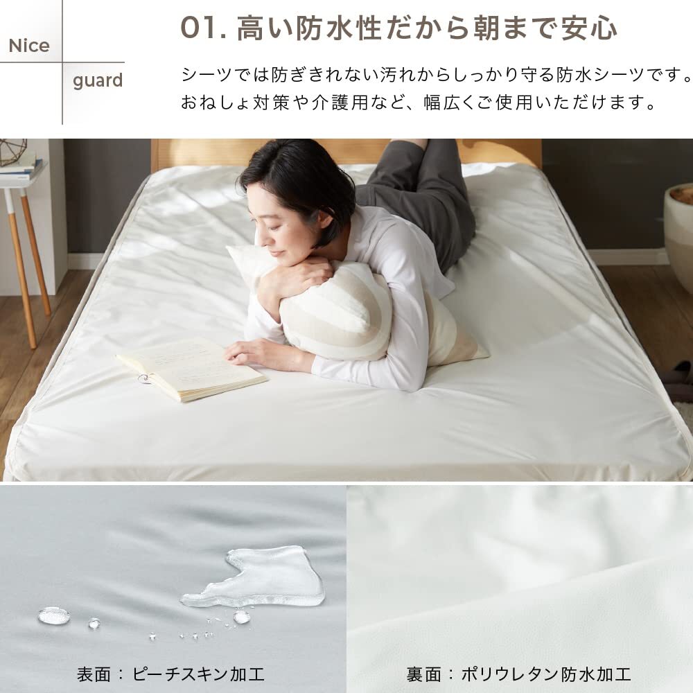 説明 商品紹介 【取返しのつかない不意な汚れから寝具をガード】 マットレスや敷布団が汚れてしまって途方に暮れたことはありませんか?カバーをしていても寝汗やおねしょ、血液などの水分は吸収されてしまい、汚れは避けられません。そんな時おすすめなのが、「NICE GUARD+(ナイスガードプラス)しっかり防水シーツ」。リーズナブルながら、洗えない敷布団やマットレスを不意の汚れからしっかり守るフラットシーツタイプの防水シーツです。 【とことん清潔!抗菌防臭加工&ダニ通過ゼロ生地使用】 長年蓄積された寝汗や尿などによる汚れは不快なニオイの元に。1日の終わりに毎日眠るベッドだからこそ、気持ちよく眠りにつきたいものですね。NICE GUARD+(ナイスガードプラス)でしっかり防水シーツは抗菌防臭加工を施しているので、イヤなニオイを抑制し、しっかり防水することで、ニオイや汚れのしみつきを防ぎます。ダニを通さない生地を使用しているので、見えないリスクからもマットレスを守ります。シーツをこまめに洗いたくない方にもおすすめ。4隅にゴムが付いたフラットシーツタイプの防水シーツなので、お洗濯の際の付け外しがラクラク。介護などで頻繁に取り替えたい方におすすめの防水シーツです。 【さらっとすべすべ、気持ちいい肌触り】 防水機能・抗菌防臭機能・ダニ対策と機能もしっかりながら、表面はさらっとすべすべで気持ちいい肌触り。ゴワゴワしにくく、やわらかな生地感です。インテリアに馴染みやすいナチュラル&シックなカラー展開からお選びいただけます。 【株式会社AQUAについて(旧社名:株式会社ナイスデイ)】 株式会社ナイスデイは、より快適な暮らしへとお客様をサポートする企業として進化すべく、2022年10月をもって株式会社AQUAと合併する運びとなりました。当社は創業125年以上を誇る日本毛織株式会社(東証プライム上場・通称ニッケ)のグループ企業です。当社では、皆様から頂戴する貴重なご意見に耳を傾け、日々品質の向上に取り組んでおります。商品についてのご質問、ご相談、ご不明点等がございましたら何なりとお申しつけください。 安全警告 アイロン・タンブラー乾燥不可