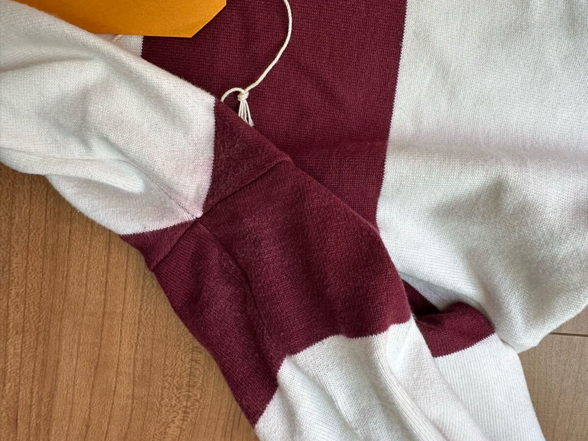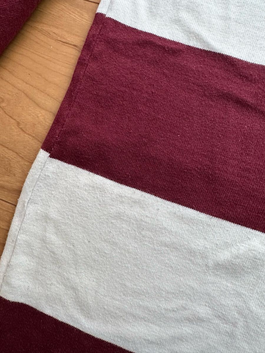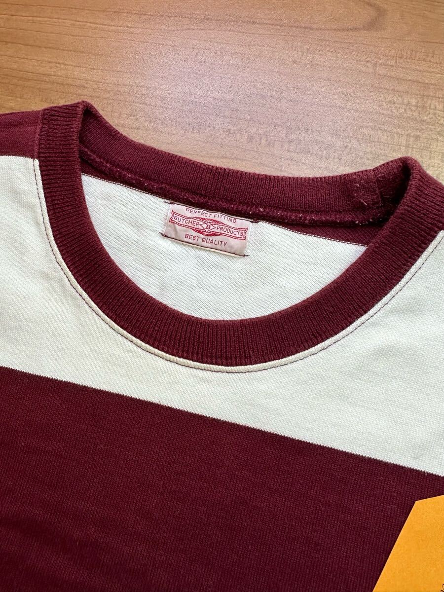 Timeworn clothing で購入した Butcher products のボーダーシャツです。色はグッドカラーの MAROON , サイズは 36 になります。発売日は開店前から並びもあって、このサイズは即完売するほどの人気商品でした。当時は気に入って着用していた為、擦れ あたり 褪色などの着用感があります。5枚目の写真のように右脇の下にちょっとした擦れがありました。また8枚目の写真のように前面の裾、真ん中辺りに薄っすらと色飛びがあります。(※6枚目は左脇の下の写真です)