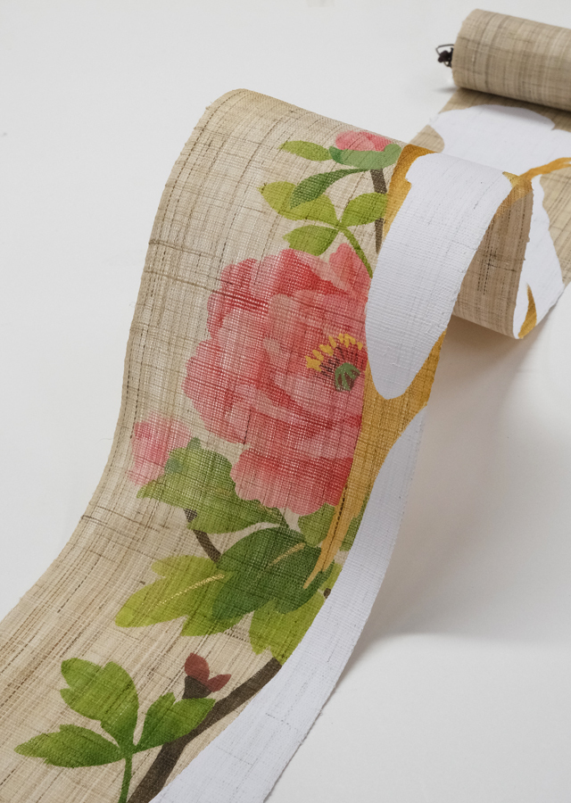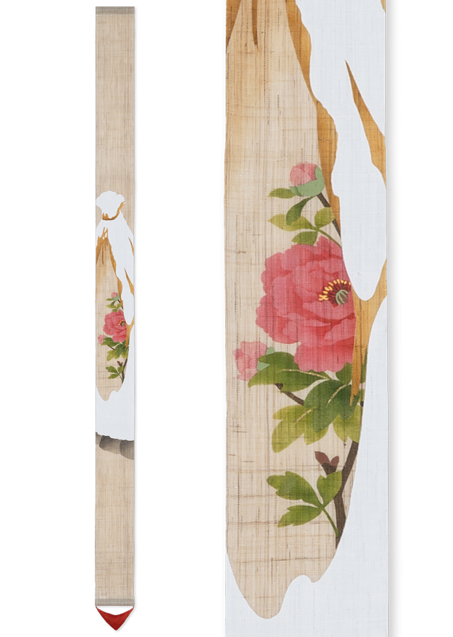厳しい寒さにも負けず、美しく咲き誇る『冬牡丹』。様々な困難に打ち勝ち、幸福を引き寄せる姿を表現しています。冬牡丹を守りその美しさを引き立てているわらぼっち(藁囲い)は、日本の風景を感じさせ温かで和やかな雰囲気をもたらしてくれます。