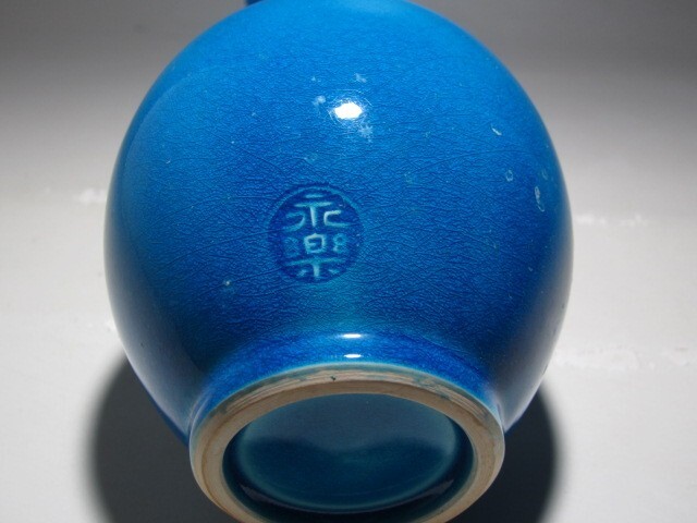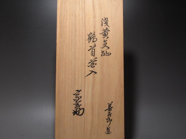 千家十職永楽善五郎作の交趾鶴首花入です。 趣のある景色の見事な名品です。 箱蓋裏に裏千家十四世淡々斎の花押があります。 【永楽善五郎(えんらくぜんごろう) 】 京焼の家元。 千家十職の「土風炉・焼物師」で、代々土風炉、茶碗などを製作してきた。 善五郎の土風炉には素焼きの器に黒漆を重ね塗りしたもの、土器の表面を磨いたものなどがある。 現在は17代目。 サイズ 直径9cm/高さ26.5cm(多少の誤差はお許しください) 状態 一見して疵やヒビ・直しは見られません。 骨董品という事をご勘案頂き、時代経過のスレや、小さな傷がある場合があるかもしれませんのでご承知置きください。 | |||