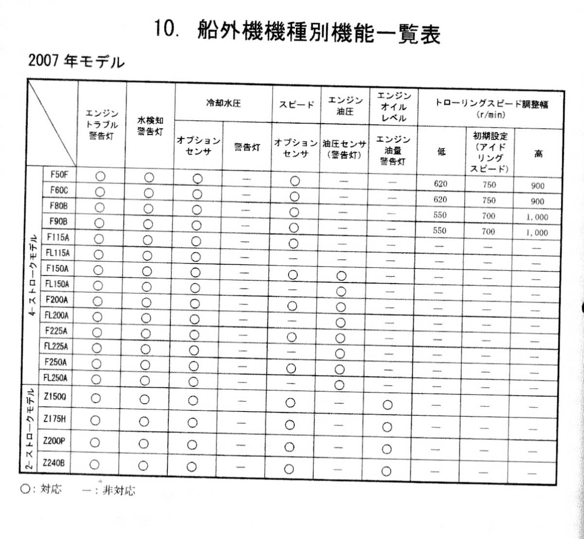 10)船外機機種別機能一覧表