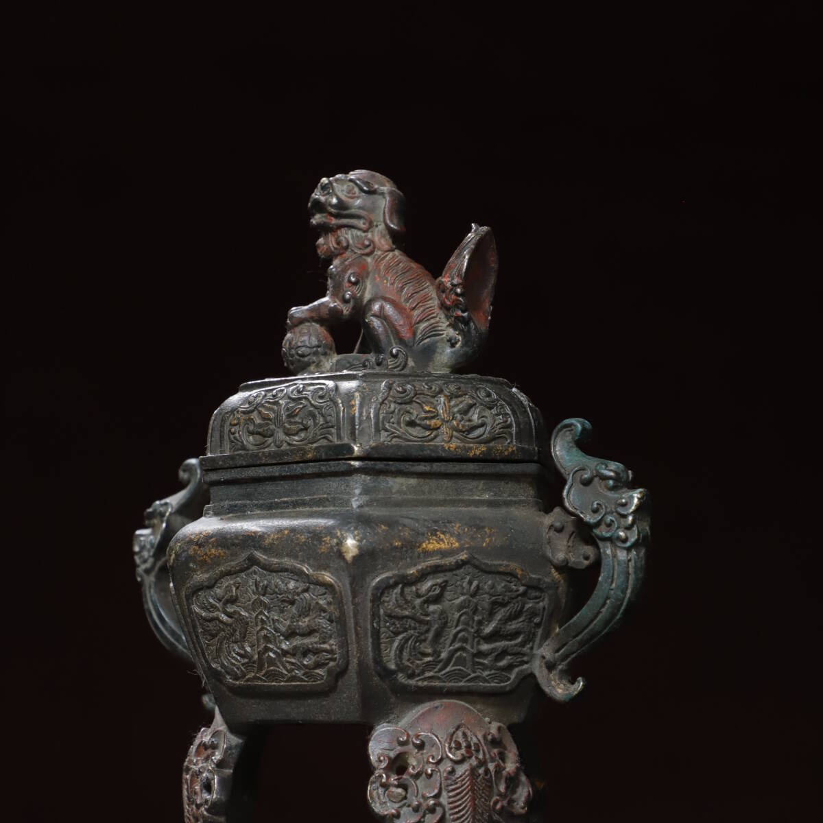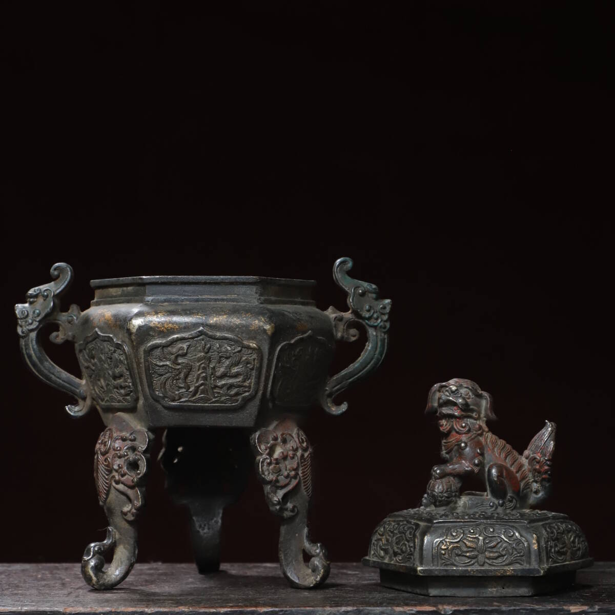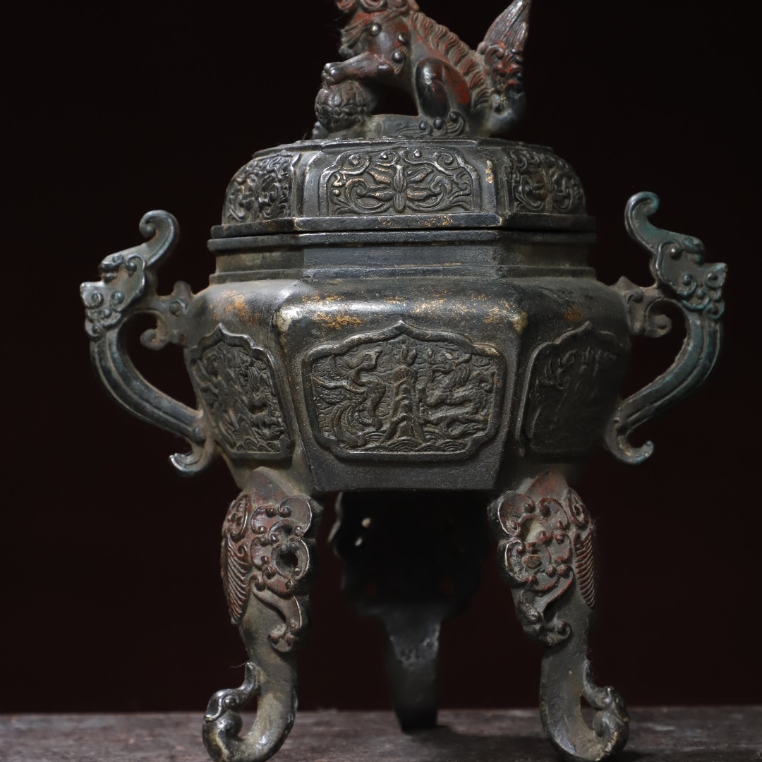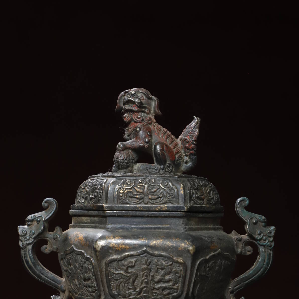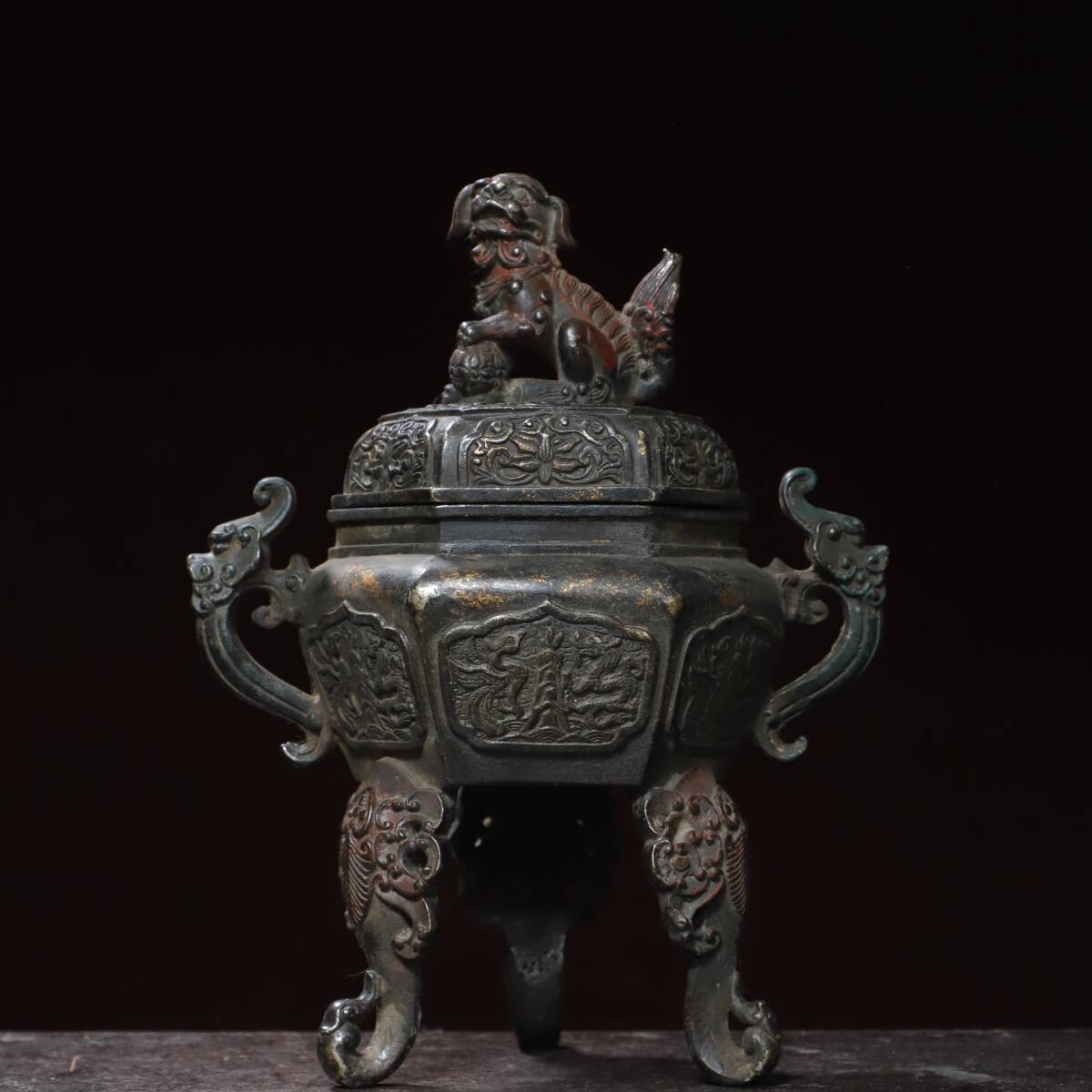 珍品 清代 銅拓金 雙耳龍龍鳳獅蓋熏香爐 極細工 時代物 古置物 中国古美術 唐物 旧蔵 S77
