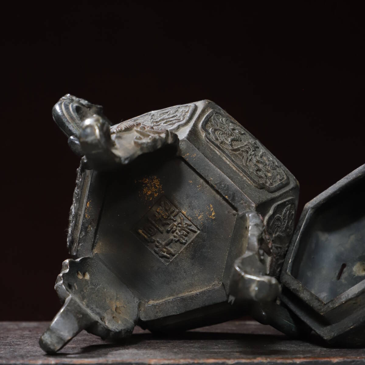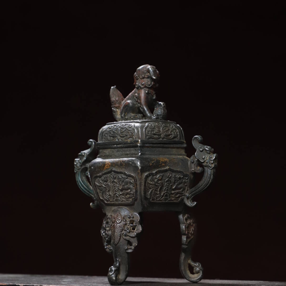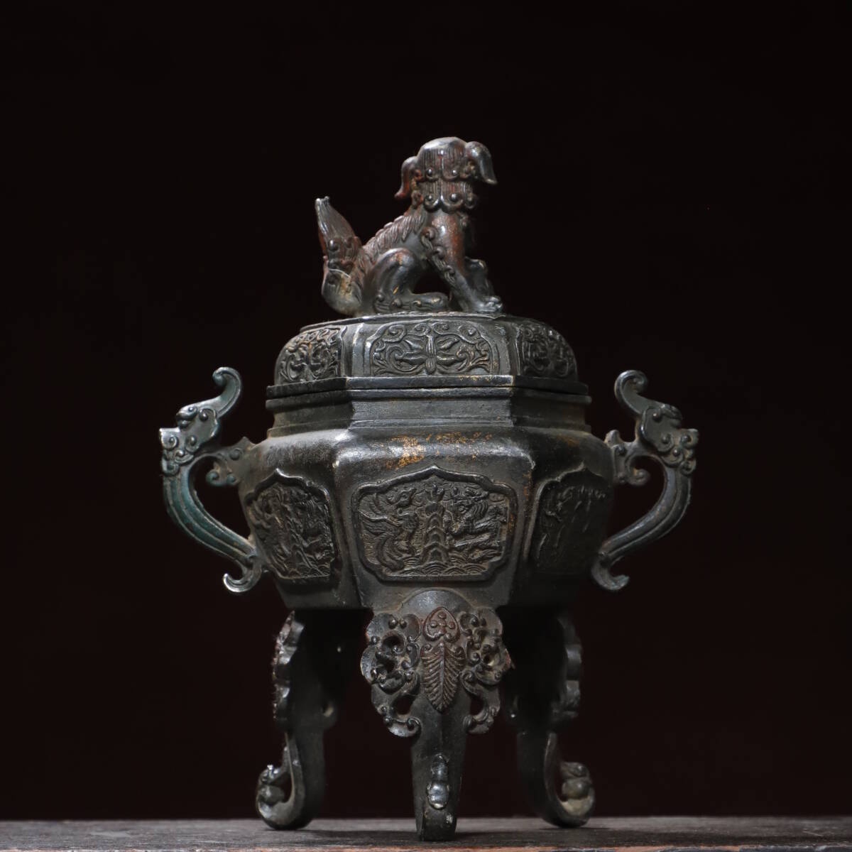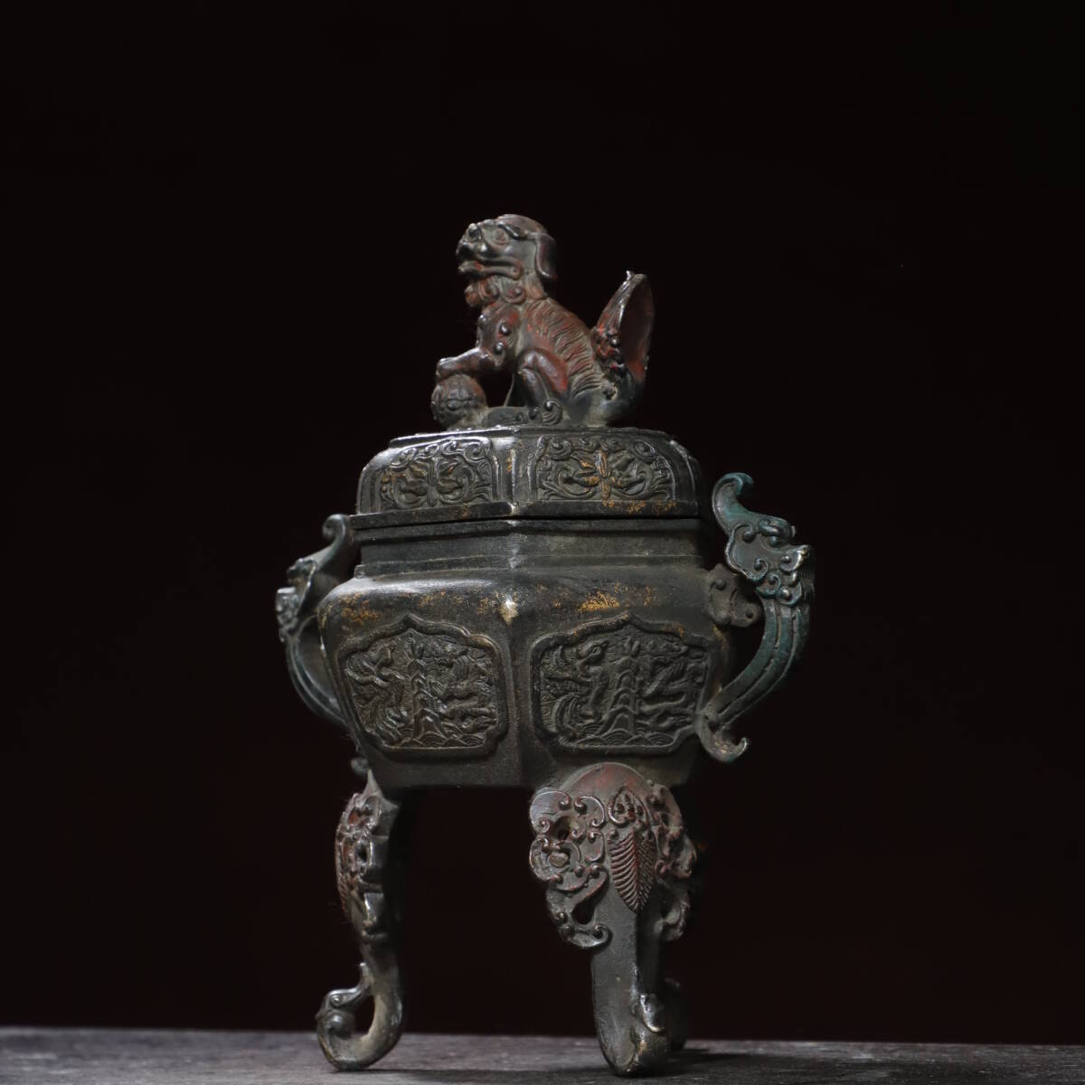 珍品 清代 銅拓金 雙耳龍龍鳳獅蓋熏香爐 極細工 時代物 古置物 中国古美術 唐物 旧蔵 S77
