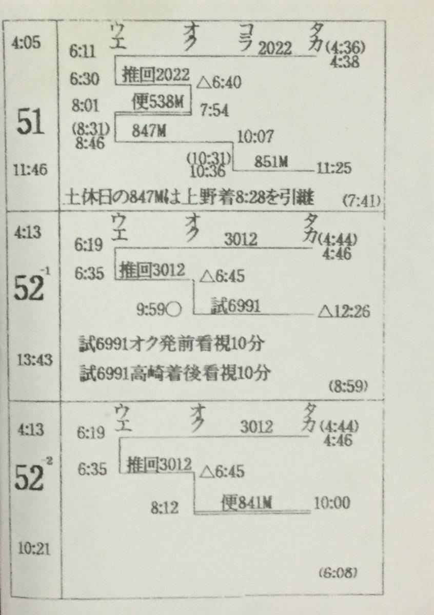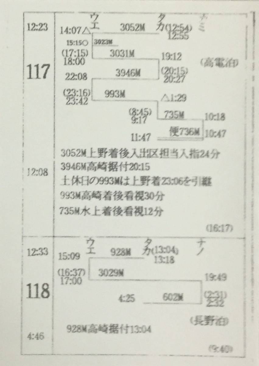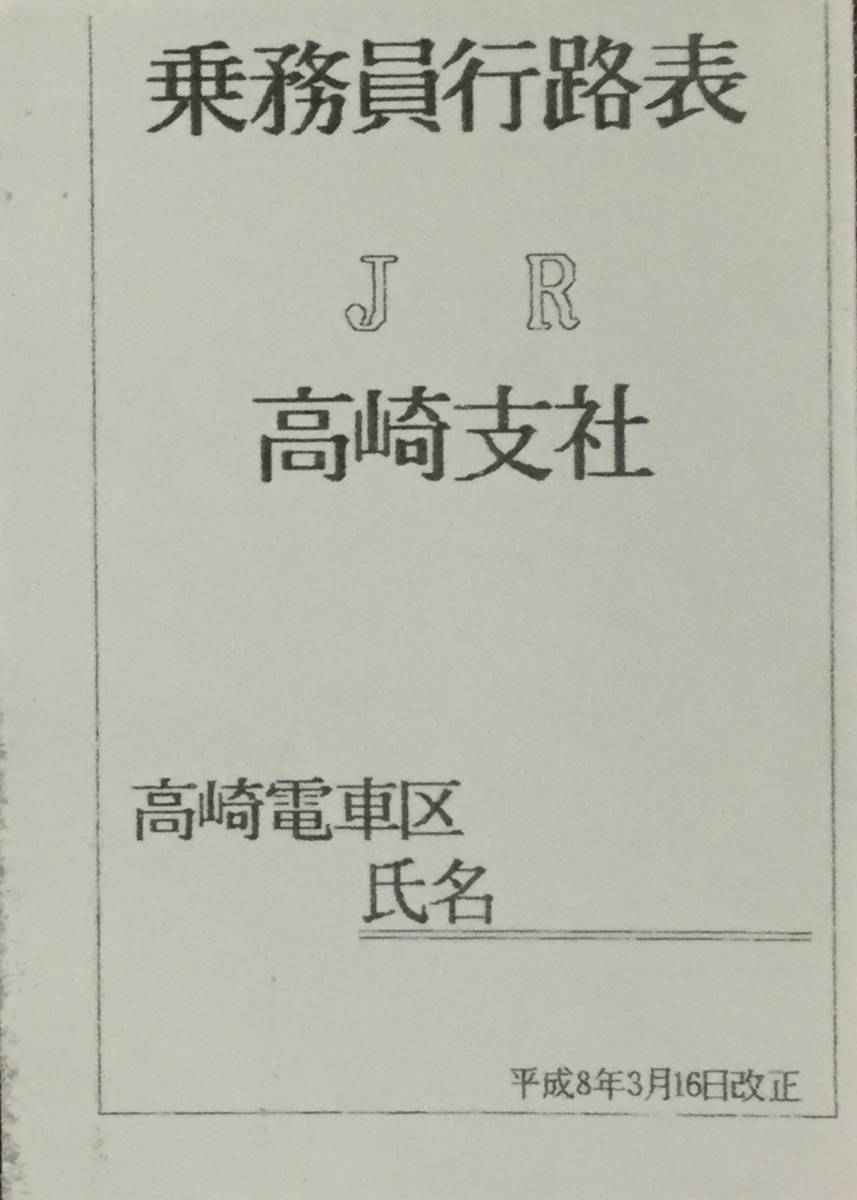 乗務員(運転士)行路表 高崎電車区 平成8年(1996年)版 です。北陸新幹線開業で廃止となった横川~軽井沢を含む特急「あさま」等が含まれています。A6サイズ31ページ分となります。30年ほど前のものであることをご理解ください。