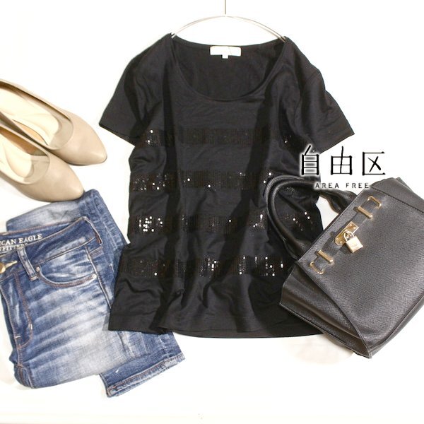 美品 オンワード樫山 自由区 綺麗め細身 スパンコール付き ストレッチ カットソー 40号 L 春 夏 25C07