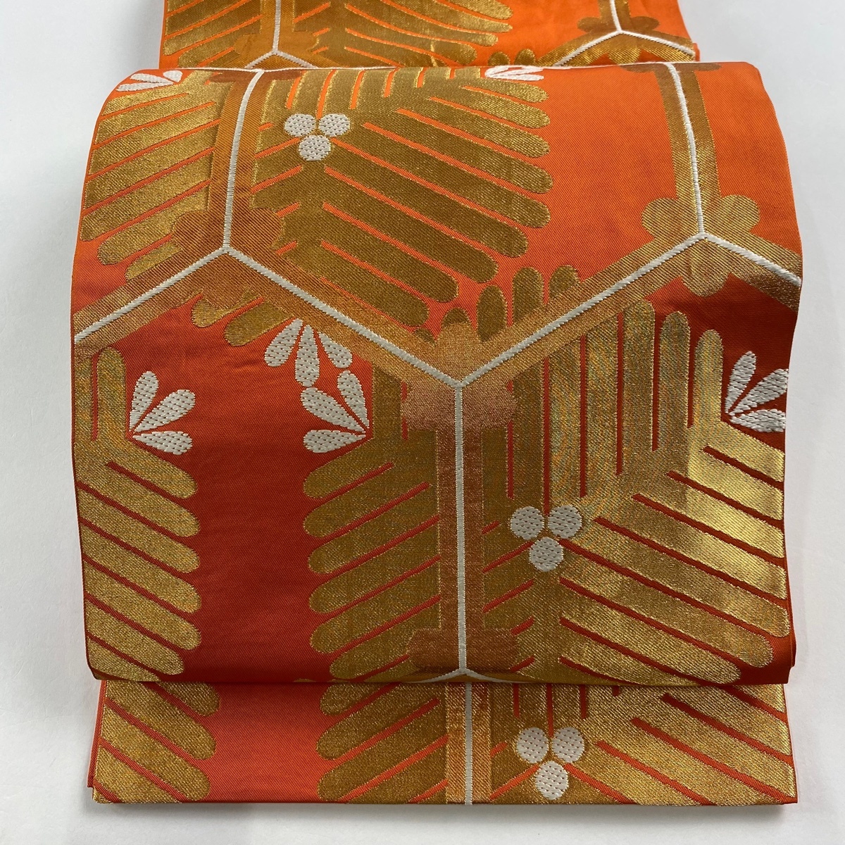 | 袋帯 名品 川島織物 落款 本袋 若松 亀甲 金糸 箔 オレンジ 六通 正絹 【中古】 |