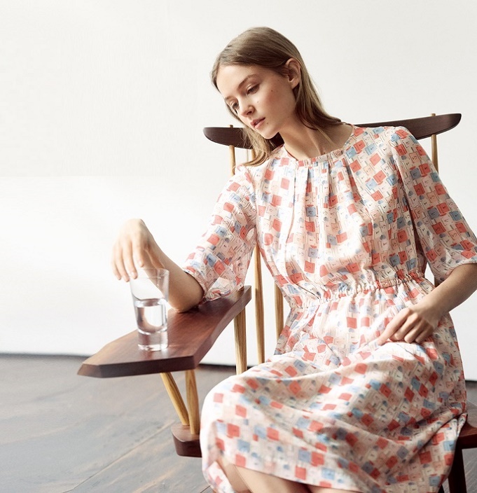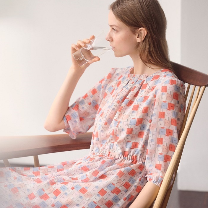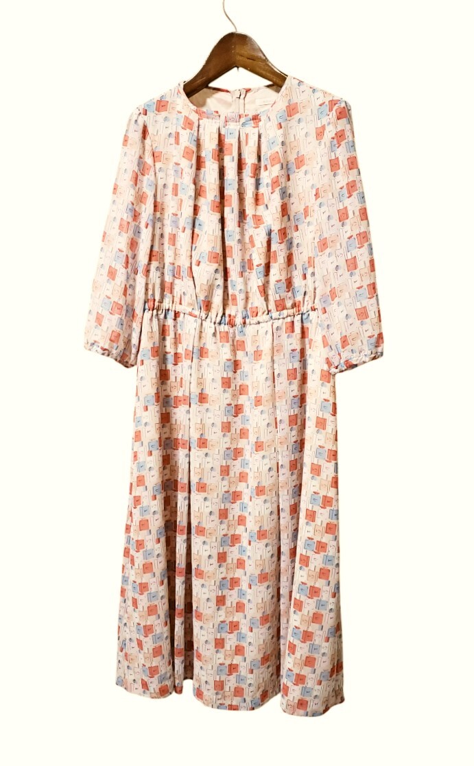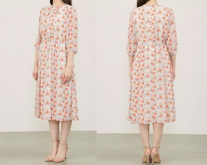 サイトより...衿ぐりからゆったりしたギャザータックの分量感とウエスト切替えのゴムギャザーが着心地の良さを兼ね備えたエレガントなドレス。