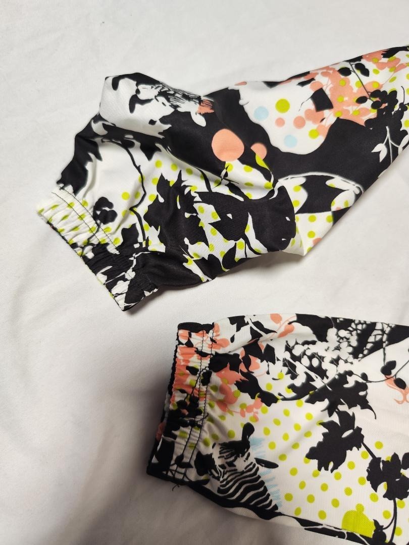 ゼブラ・キリンなどのアニマル柄に、植物やドットが重なったアートのような総柄デザインが魅力。