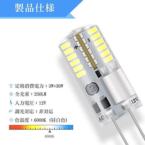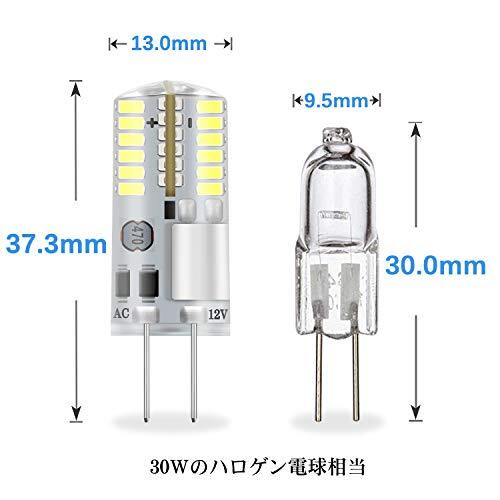 商品説明 | ?口金:G4、電圧:12V、色温度:6000K(昼白色)、配光:全配光タイプ、全光束(明るさ):250lm、定格消費電力:3W。?※ホタルスイッチと組み合わせて使用しないでください。(消灯時に、電球が薄く光ったままの状態になる場合があります。) ?消費電力が3Wだけで30Wのハロゲン電球相当の明るさが実現、約90%の電気代を節約できる省エネで経済的なled電球です。ご注意:サイズはハロゲン電球より少し大きめなので、ご注文の前に必ずご確認ください(弊社の電球:13mm*37.3mm、ハロゲン電球:9.5mm*30mm)。 ?フリッカーが出ない照明が実現!撮影の際に映像がちらつき・フリッカー現象がないほど目に優しい照明です。また、シリコンを採用したため、高い光透過率を持ち、熱もこもりにくく、放熱性能が高いです。 ?全方向360度照明で、光が全方向へ広がります。物の色を自然で綺麗に再現させ、柔らかくて綺麗な光を出し、部屋の雰囲気をアップします。 ?使用寿命は約25000時間まであり、頻繁にランプ交換が不要です。その上、ご購入日より一年間の保証を提供いたします。安心して弊社の商品をお使いください。
