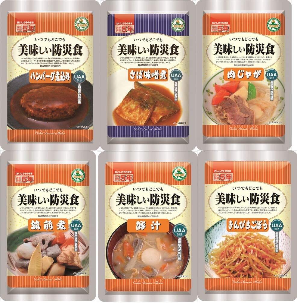| 商品名 | 【常温5年保存】美味しい防災食6種(ハンバーグ煮込み、サバ味噌煮、肉じゃが、筑前煮、豚汁、きんぴらごぼう) 防寒保温用アルミブラン |
