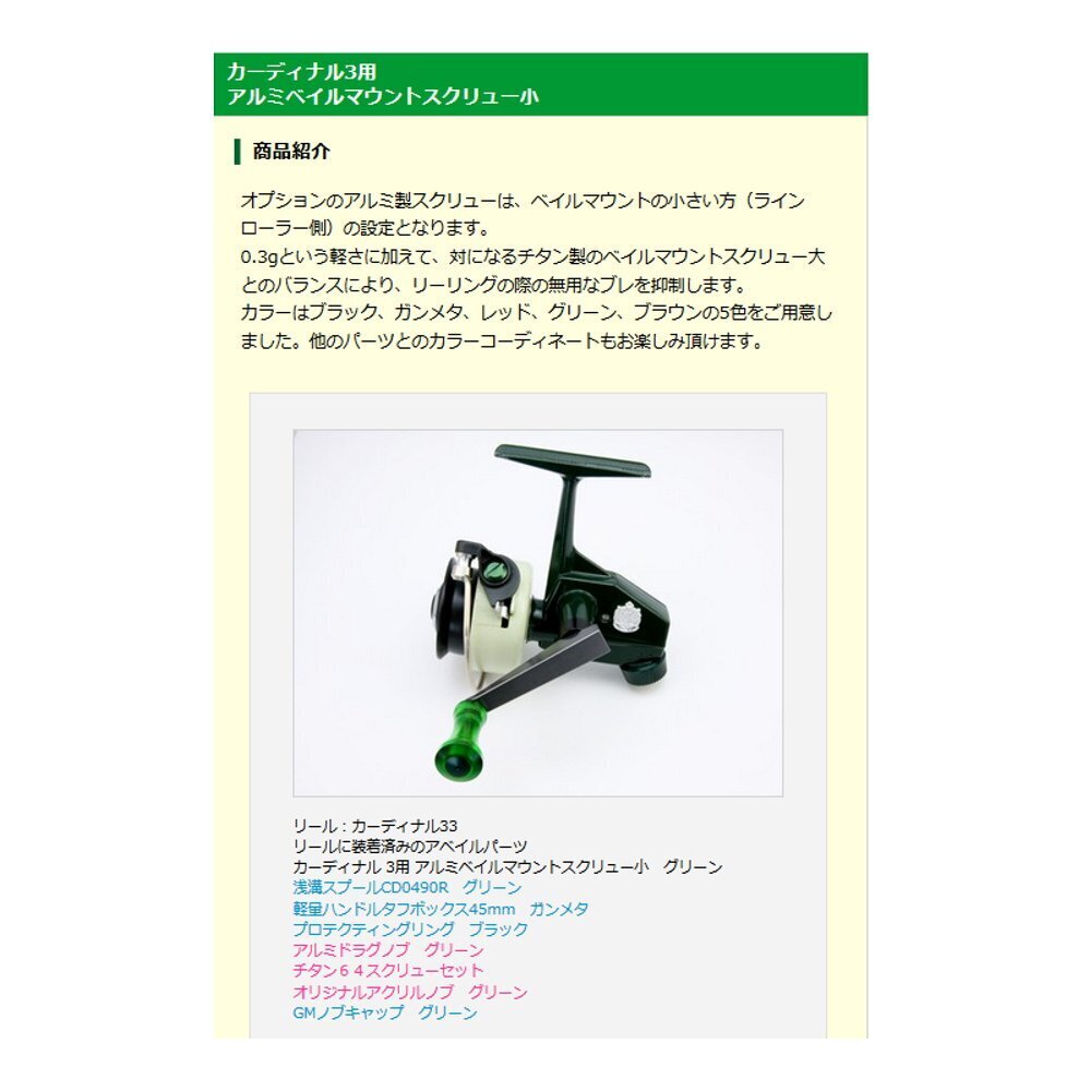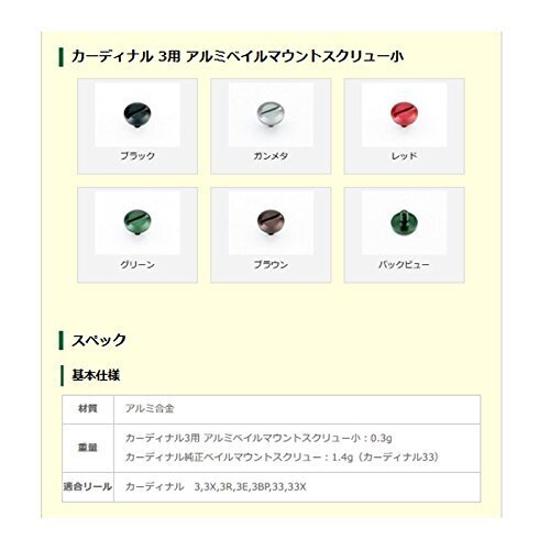 カラー:レッド材質:アルミ合金重量:カーディナル3用 アルミベイルマウントスクリュー小 0.3g重量:カーディナル純正ベイルマウントスクリュー 1.4g(カーディナル33)適合リール:カーディナル 3,3X,3R,3E,3BP,33,33Xオプションのアルミ製スクリューは、ベイルマウントの小さい方(ラインローラー側)の設定となります。0.3gという軽さに加えて、対になるチタン製のベイルマウントスクリュー大とのバランスにより、リーリングの際の無用なブレを抑制します。カラーはブラック、ガンメタ、レッド、グリーン、ブラウンの5色をご用意しました。他のパーツとのカラーコーディネートもお楽しみ頂けます。
