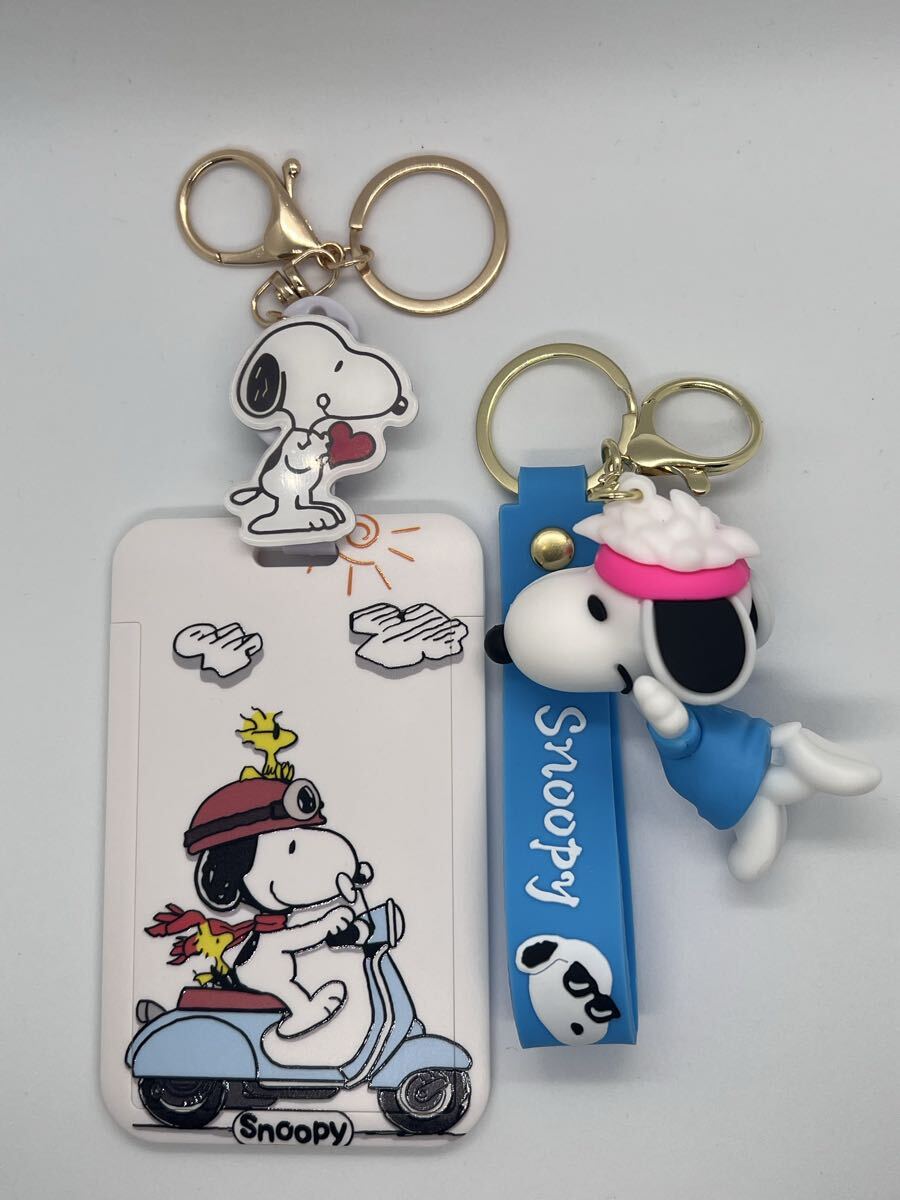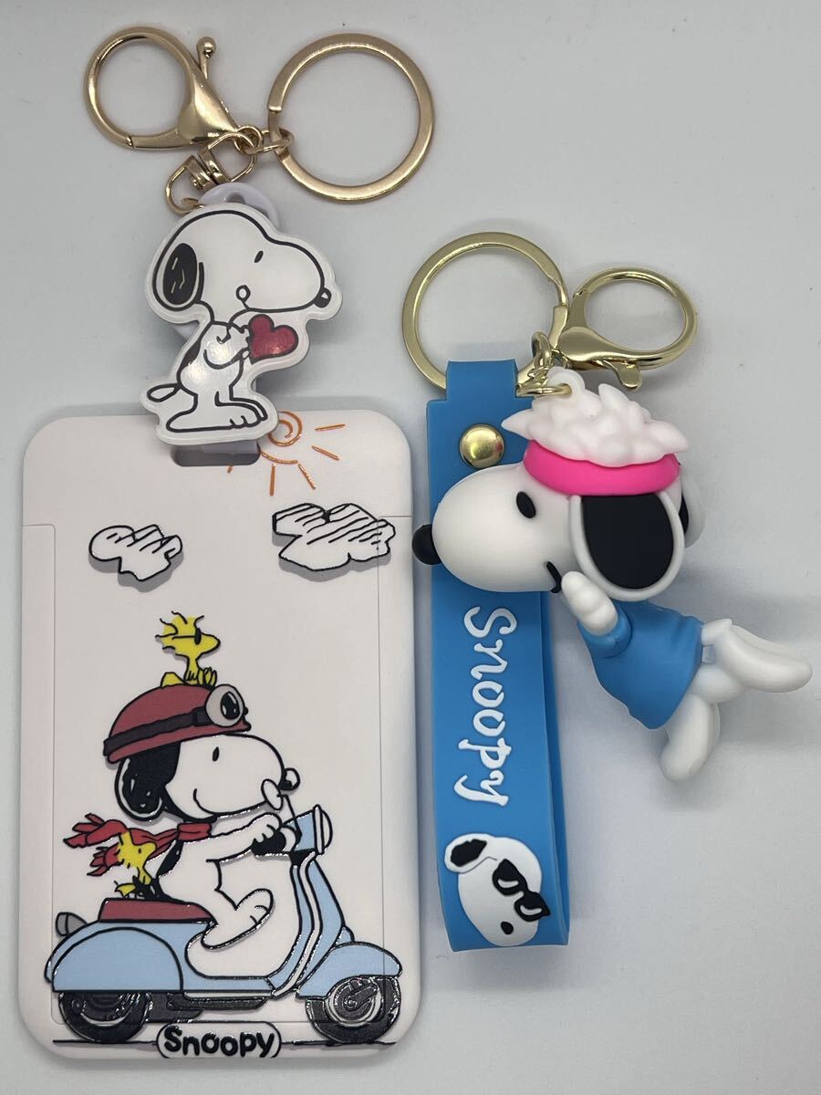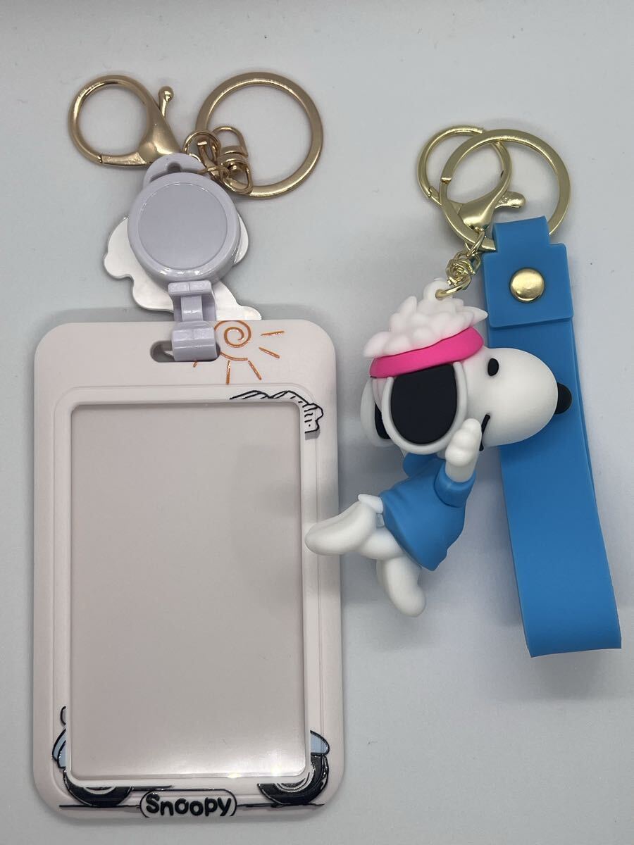スヌーピーのイラストが特徴的なカジュアルなキーホルダーとIDカードホルダーのセット。