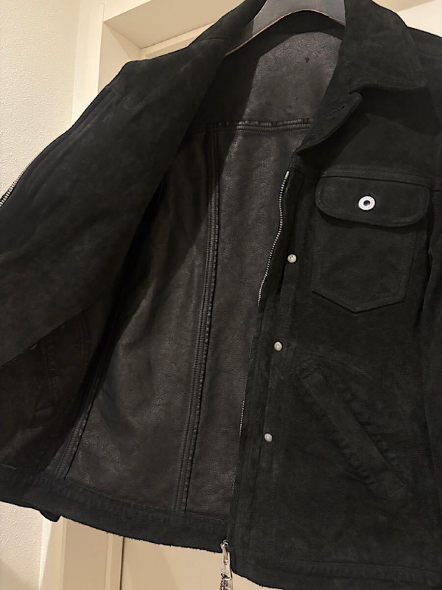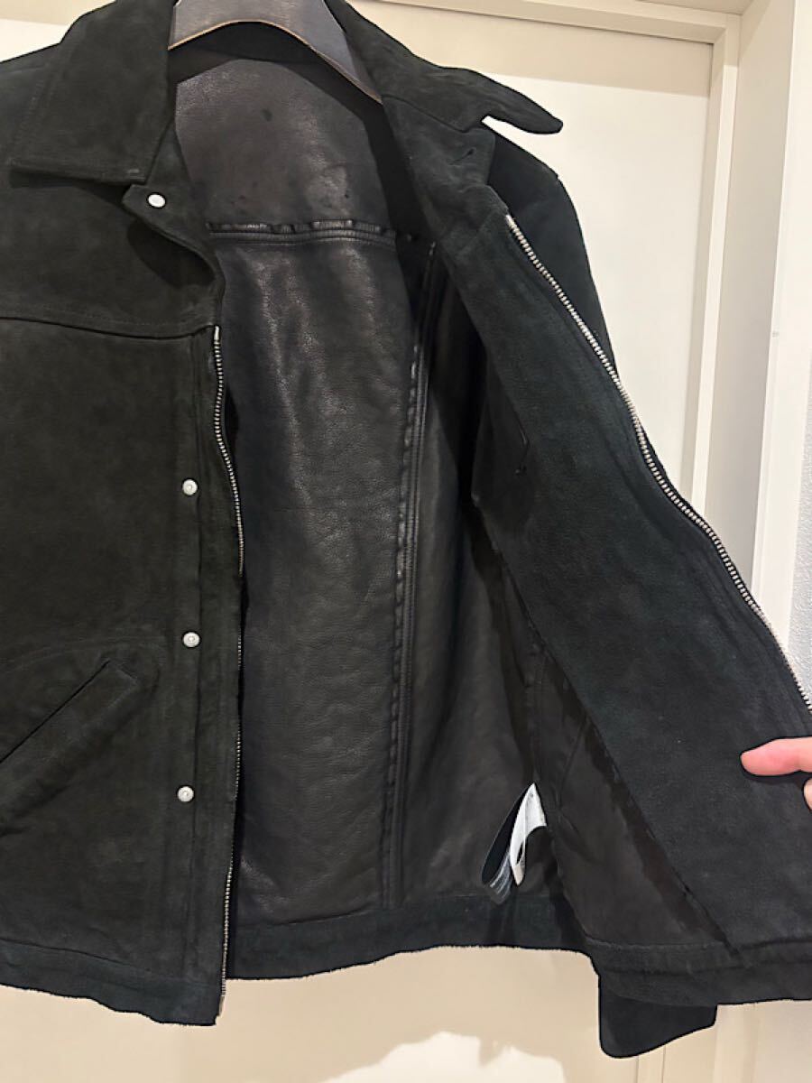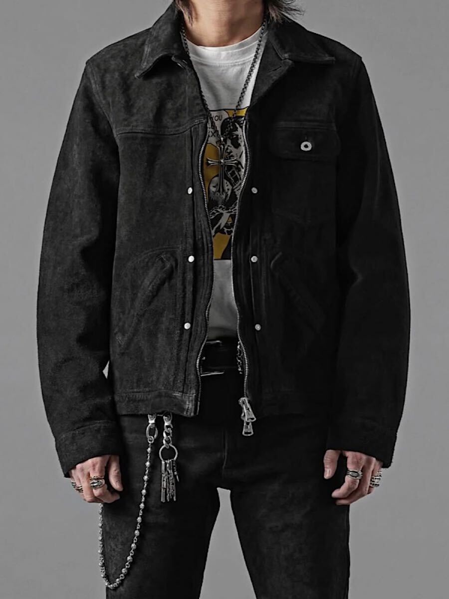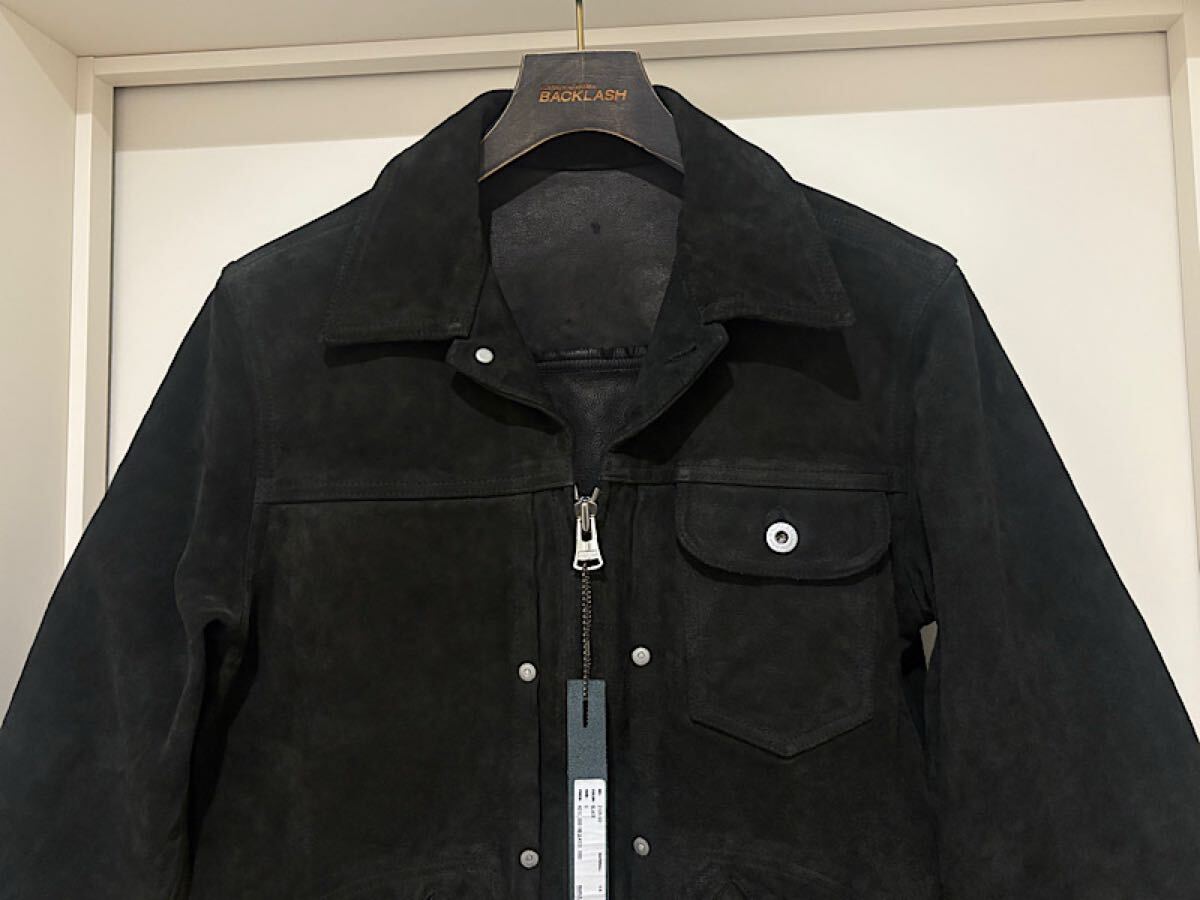 製品染色による陰影を伴ったムラのある荒々しい表情が加わることにより、これまでのスエードレザー製品の中でも特に独自の存在感を放つ一着に仕上がっています。