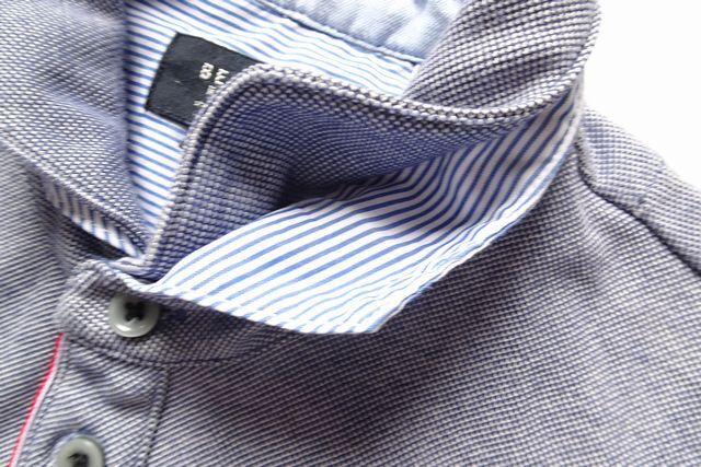 小さめ襟デザイン、襟はリブ素材、ストライプ柄布帛生地の二重になっています。