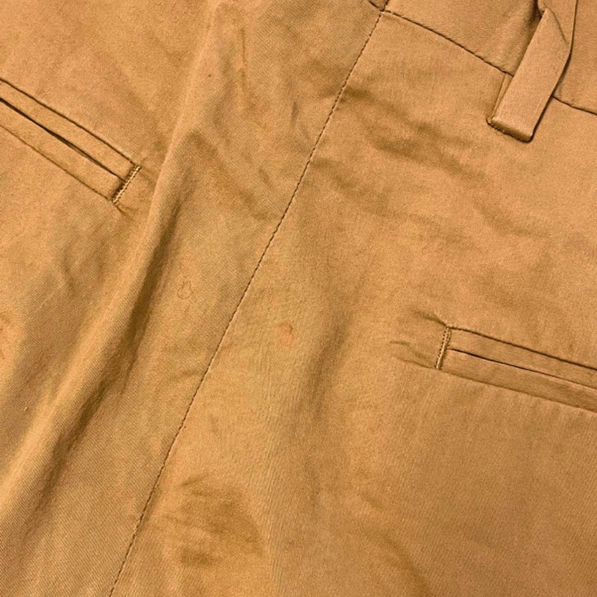 全体に目立つ色褪せ、所々に薄汚れ、ヒップに赤い汚れ、保管時のニオイ移り、使用感、恐らく裾上げ処理が施されております。