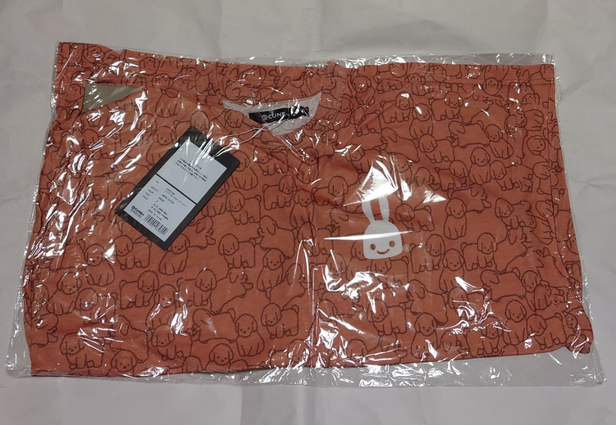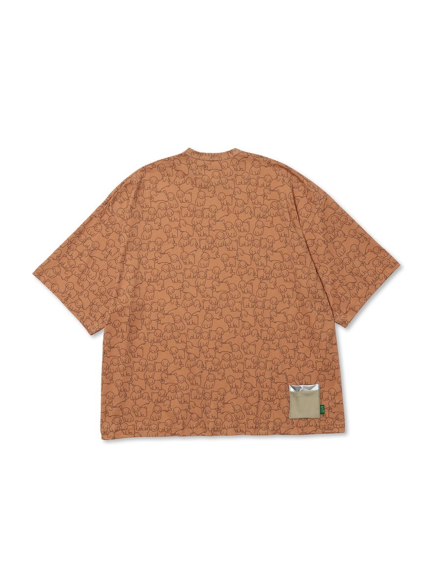 発色の良いオリジナル総柄プリントの天竺を使用したビッグT。襟はバインダー仕様になっており、脇線が少し斜め前に傾斜したパターンになっています。お犬様の軽食が入りそうな小さなポケットが付いています。