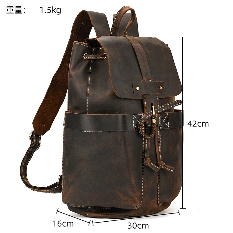 この高品質な本革バックパックは、アンティーク風デザインとビンテージ感が魅力の一品です。サイズは高さ42cm、幅30cm、奥行き16cm、重さ約1.5kgで、普段使いはもちろん、旅行やアウトドアにも最適です。外側には収納ポケットが複数あり、携帯や小物をさっと取り出すのに便利です。また、内部にはノートパソコンや書類を収納できる広々としたスペースがあり、通勤?通学用のバッグとしても大変便利です。