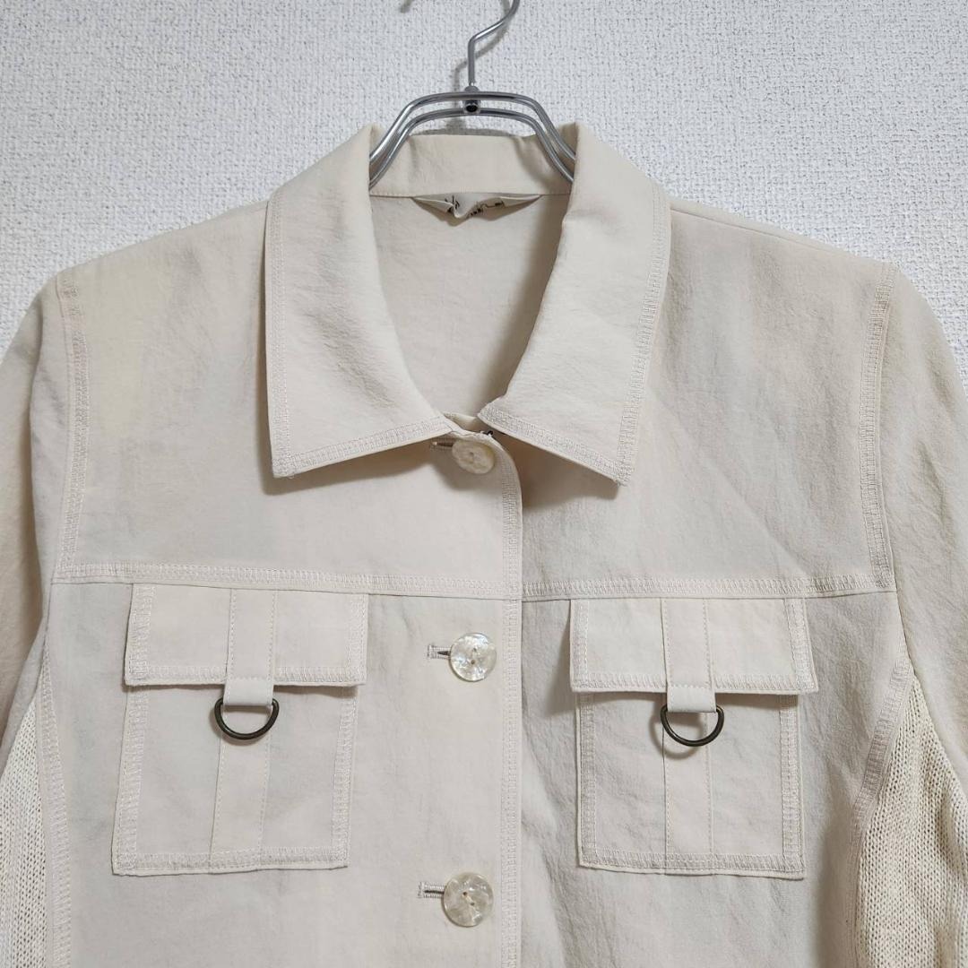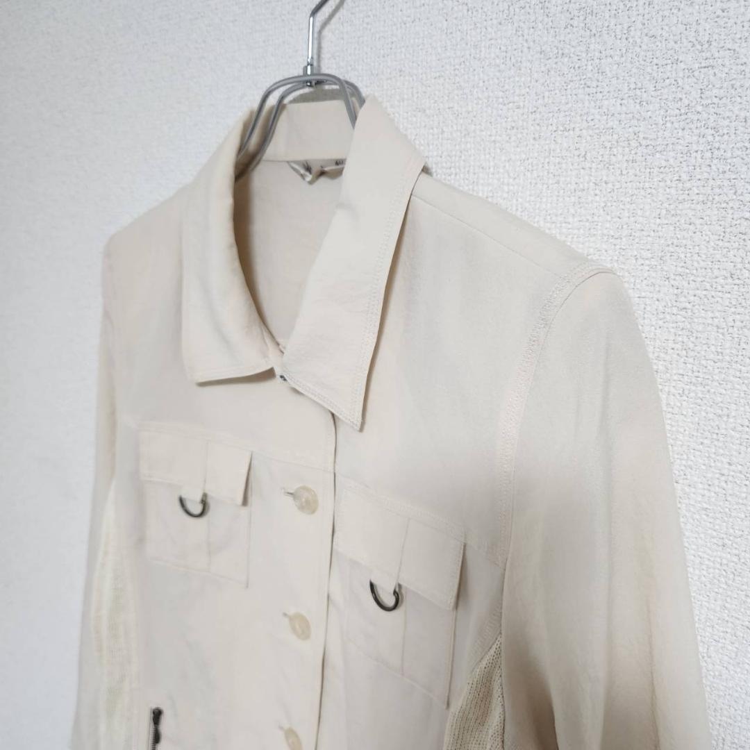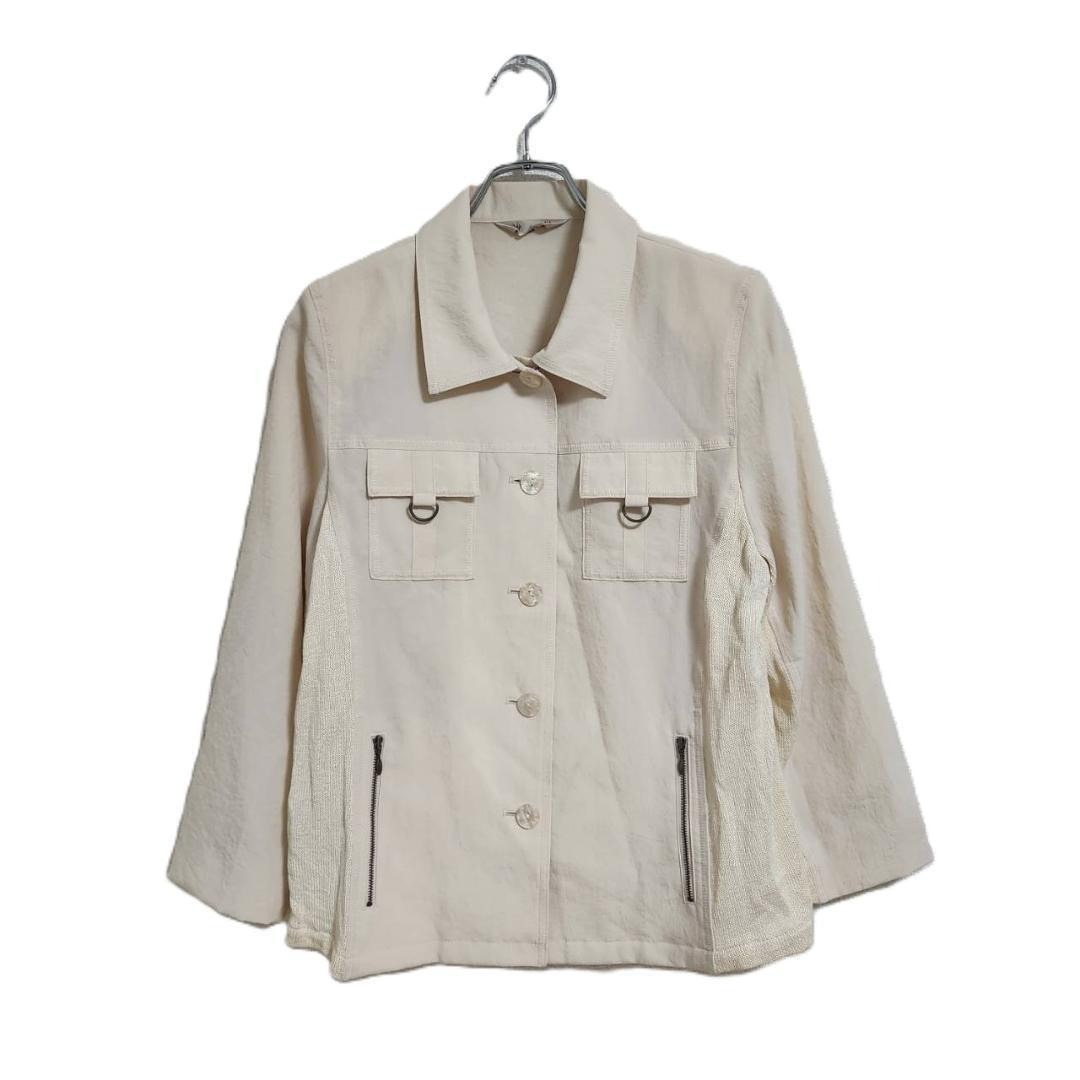 沙由梨のジャケットです。アイボリーカラーで柔らかな雰囲気を持ちながら、フロントポケットやDリングのアクセントがあり、きれいめにもカジュアルにも合わせやすい一着です。
