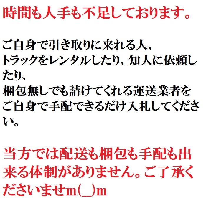 トラックをレンタルしたり知人に依頼したりご自身で引取に来れる人または、梱包無しでも請けてくれる運送業者をご自身で手配できる人だけ入札してください。