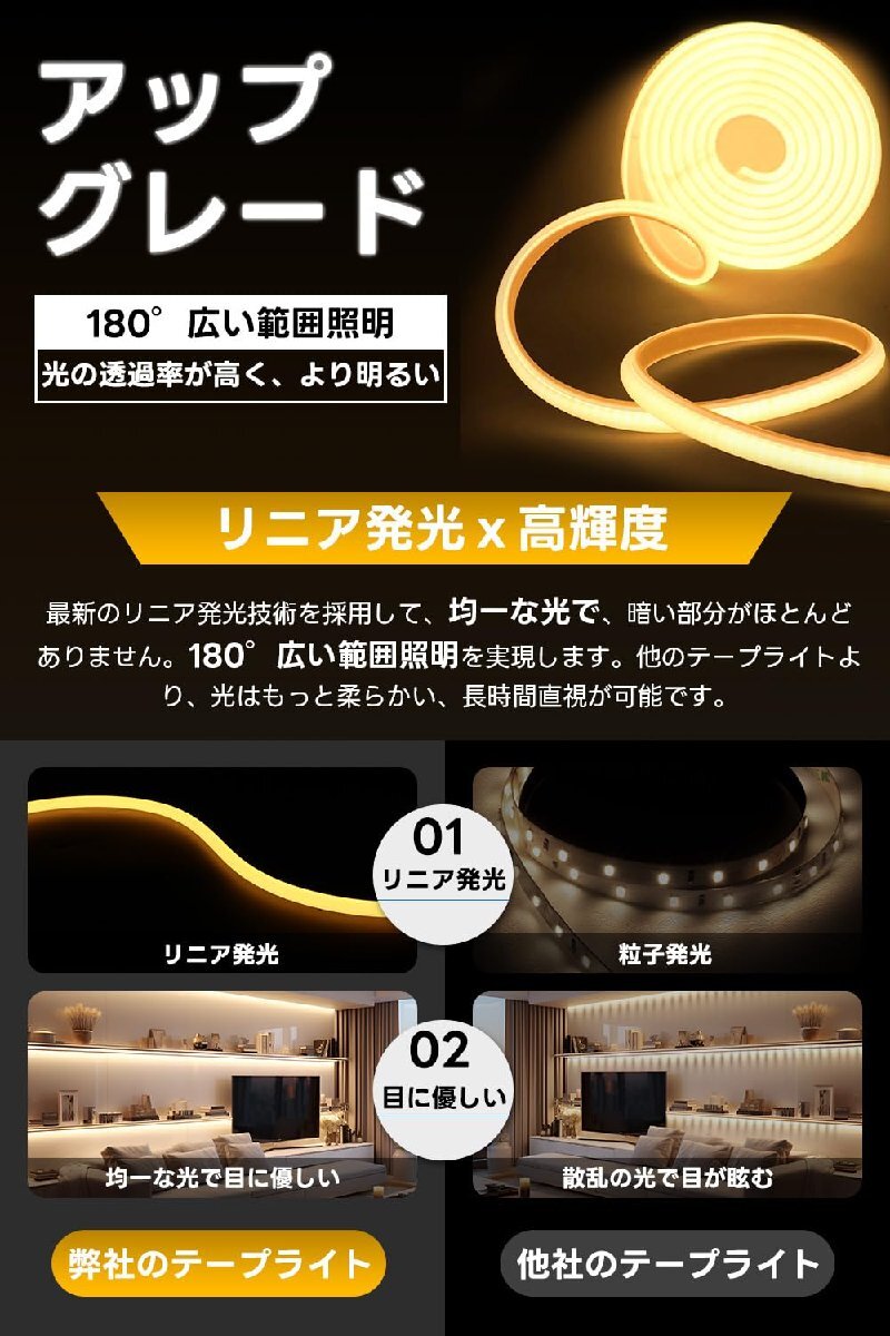 【高輝度&ライン発光】最新のリニア発光技術を採用して、均一な光で、暗い部分がほとんどありません。他のテープライトより、光はもっと柔らかい、長時間直視が可能です。