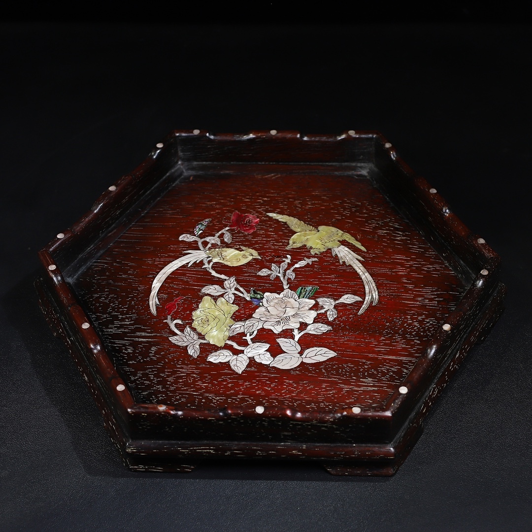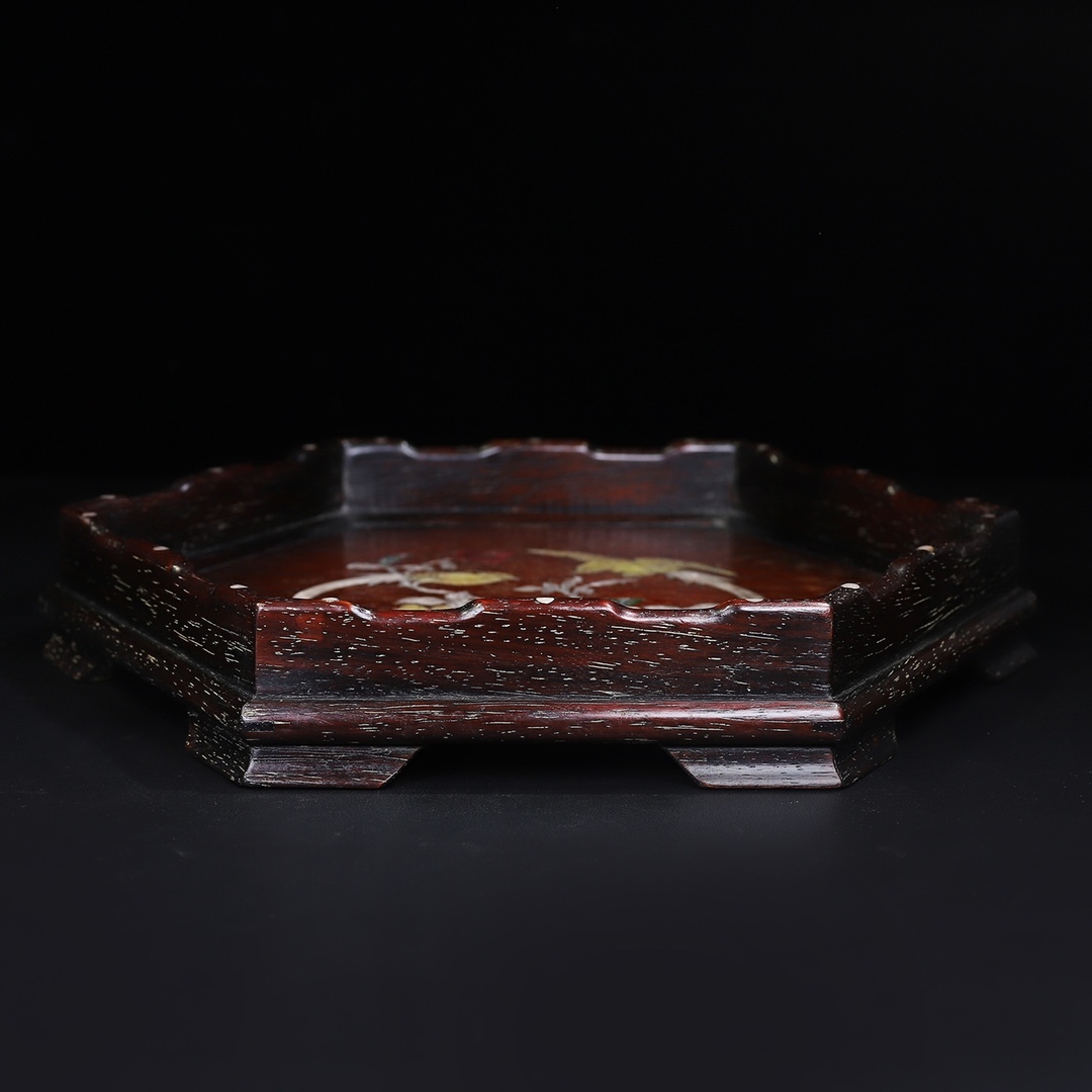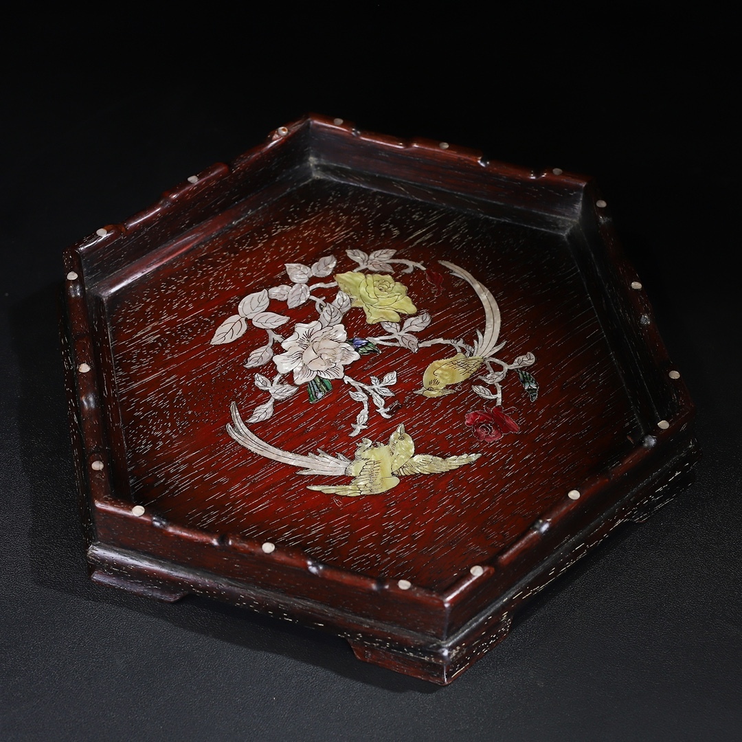 *珍品旧蔵* 清 紫檀木 はめ込む貝殼 六角曲線邊 茶盤 託盤 收納盤 木製 極細工 中国古玩 骨董品 古美味 H49
