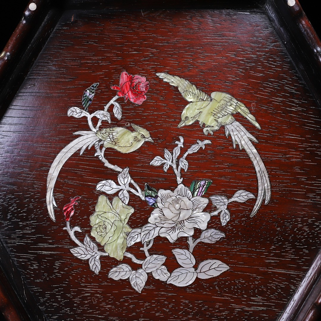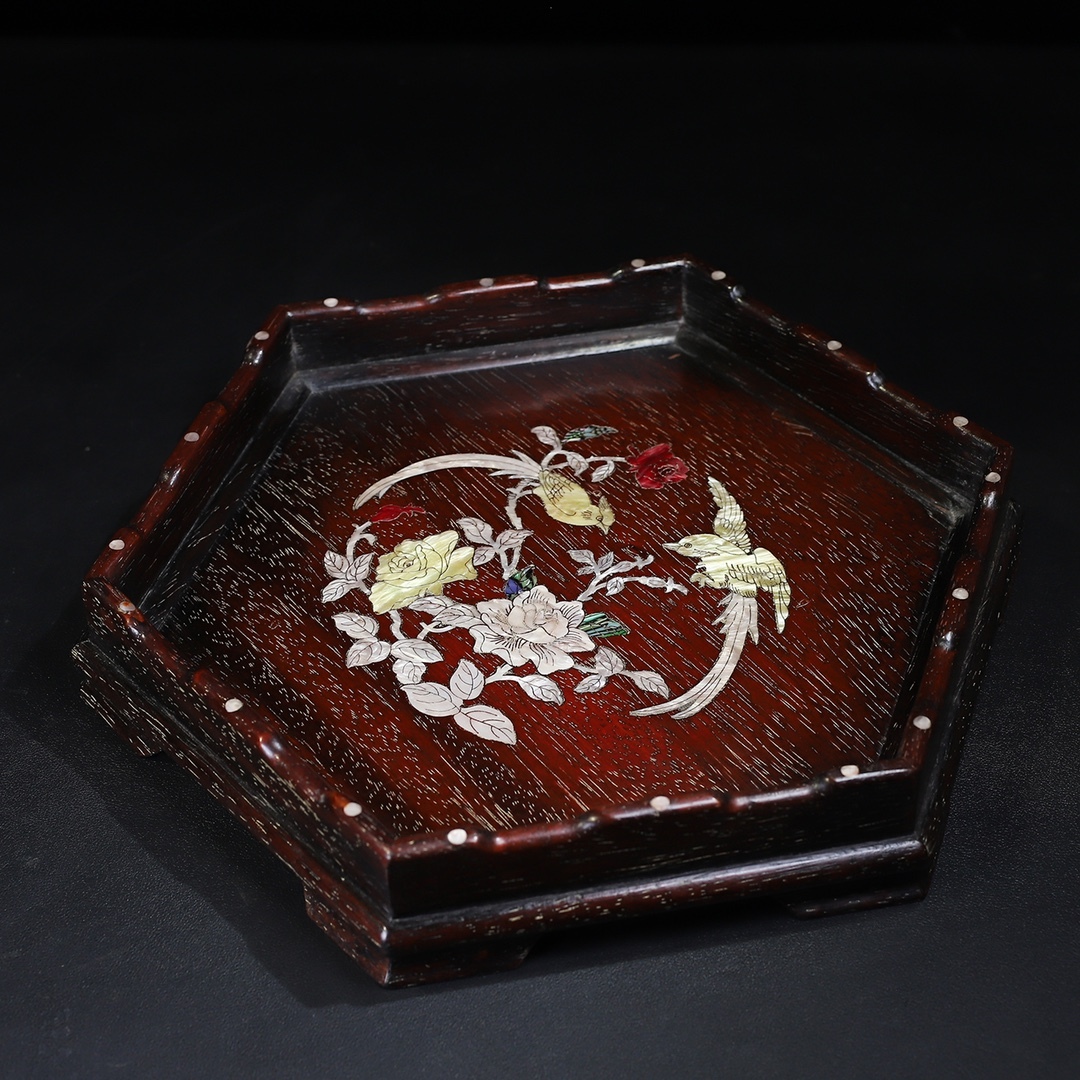 *珍品旧蔵* 清 紫檀木 はめ込む貝殼 六角曲線邊 茶盤 託盤 收納盤 木製 極細工 中国古玩 骨董品 古美味 H49